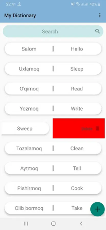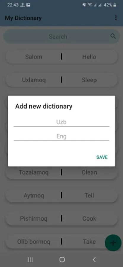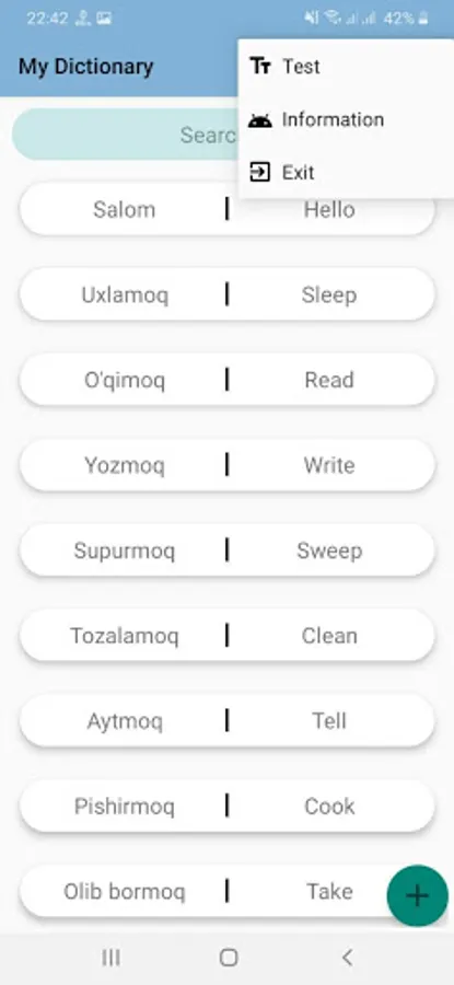 Assalomu aleykum hurmatli foydalanuvchilar. Ushbu programma ingliz tilini o'ganishni boshlagan yoki endi boshlayotgan hamyurtlarimiz uchun judayam foydali. Buni ishlatish judayam oson . Huddi lug'at daftar kabi bunga ham so'z qo'shib boriladi va o'zingiz qo'shgan so'zlarni tez va oson yodlash uchun tepadan test bo'limiga o'tib test orqali so'zlarni mustahkamlab yodlashingiz oson bo'ladi.