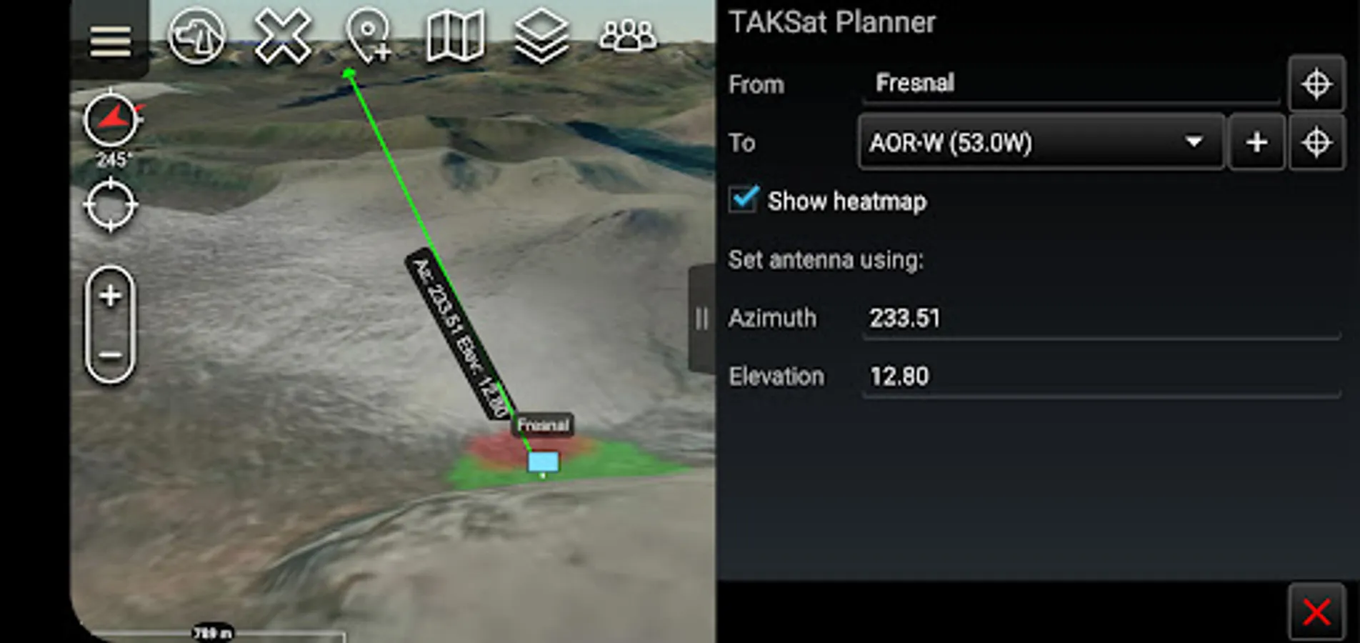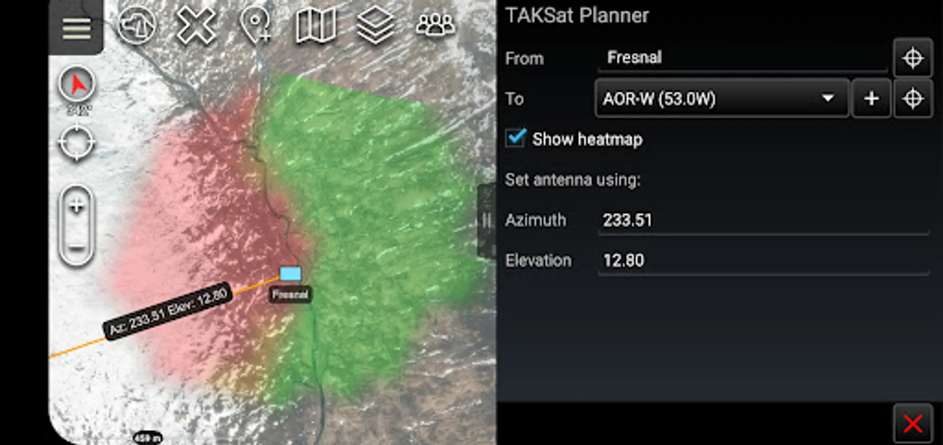 The TAKSat Planner tool calculates the Azimuth and Elevation required to achieve communication with a Geostationary satellite.