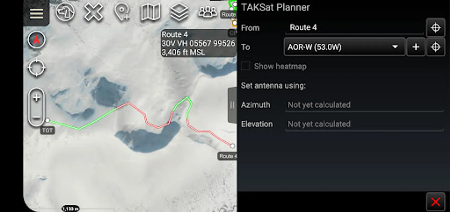 When available, it uses Digital Terrain Elevation Data (DTED) to determine terrain masking and whether communications are likely to be achieved. This can be from a fixed point or along a route. The tool can also generate a heatmap around a selected ground location to determine where in the local area communications are likely to be achievable from.