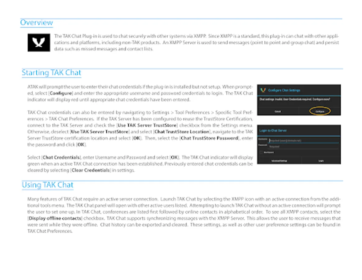 Using the XMPP standard, this plug-in can chat with other applications and platforms, including non TAK products. Primary features currently include: