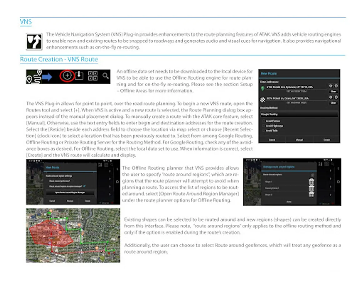 The Vehicle Navigation System (VNS) Plug-in provides enhancements to the route planning features of ATAK. VNS adds vehicle routing engines to enable new and existing routes to be snapped to roadways and generates audio and visual cues for navigation. It also provides navigational enhancements such as on-the-fly re-routing.