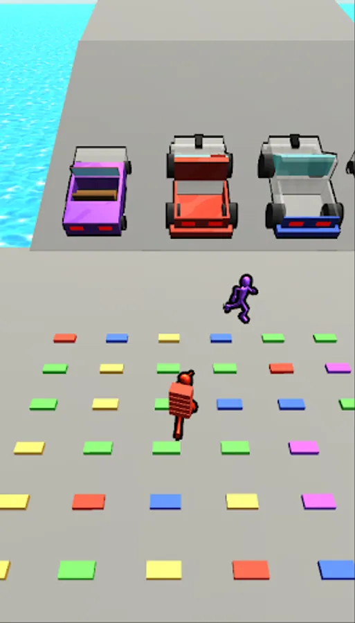 Collect the blocks that match the color of your character, and throw them on a car you want to build. Build the car as quick as possible and go for the car race.