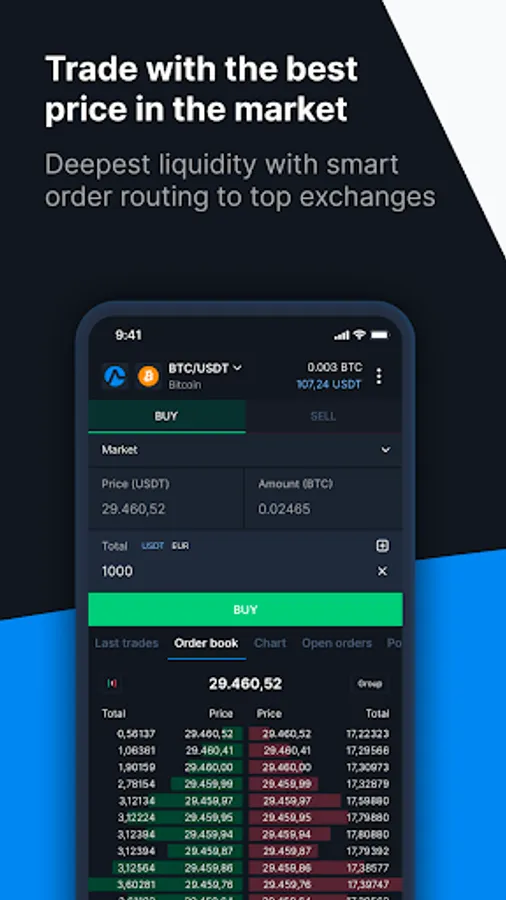 - Get always the best price with aggregated liquidity and smart order routing to top exchanges.
