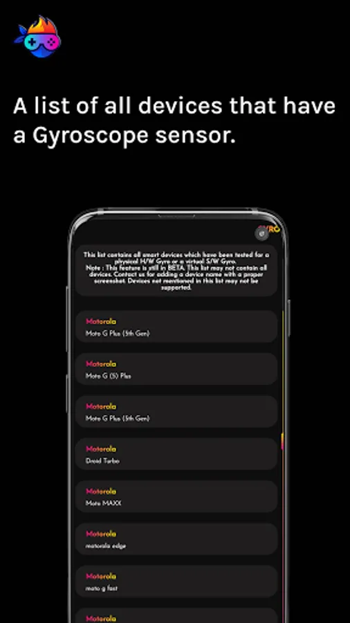 The app lets you detect if the device has a Gyroscope sensor. No guesswork, no database, the information is retrieved straight from your device.