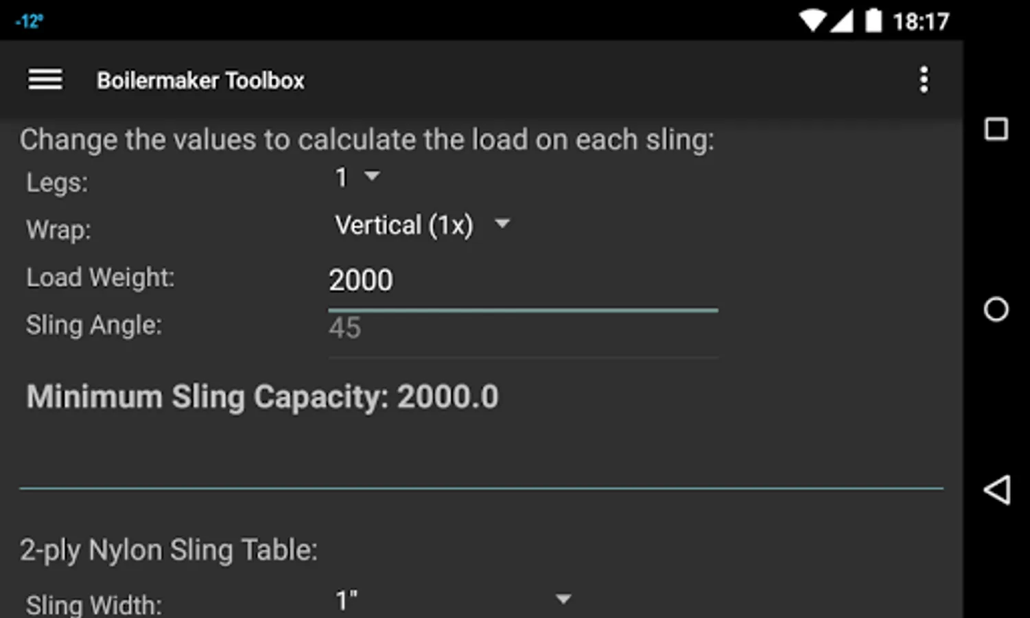 -Rigging Calculator: finds load on slings, nylon sling table.