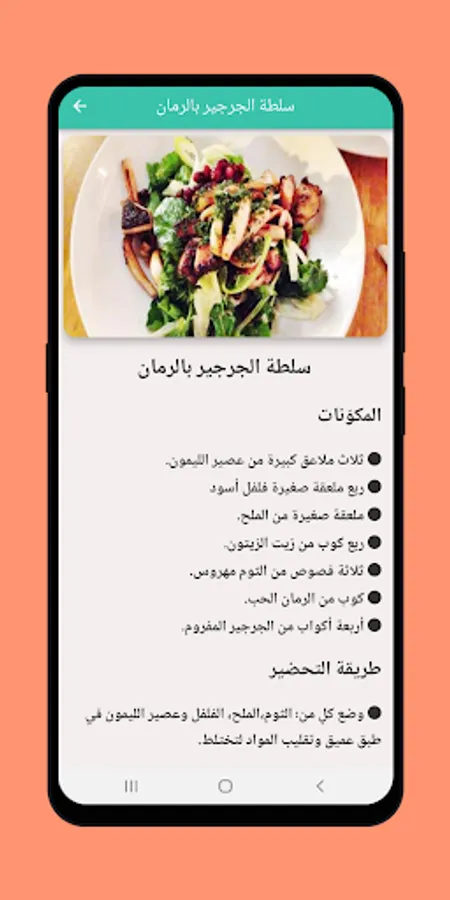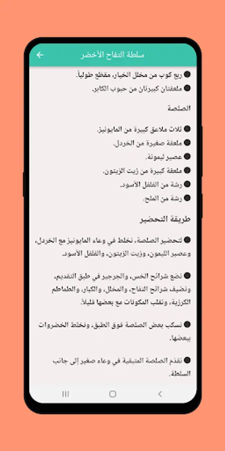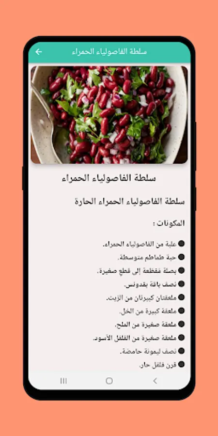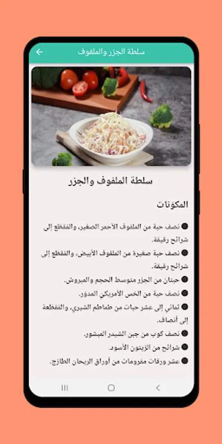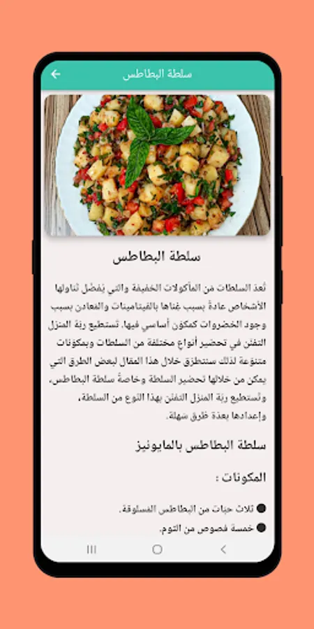 The application includes recipes that are low in calories, rich in fiber, and healthy and delicious salads. The application includes recipes for preparing healthy dishes such as potato salad, potato salad with mayonnaise, carrot and cabbage salad, cabbage salad with olives, watercress salad with pomegranate, green apple and red bean salads, and Main dishes, vegetable tray in the oven, and make vegetables with bechamel.