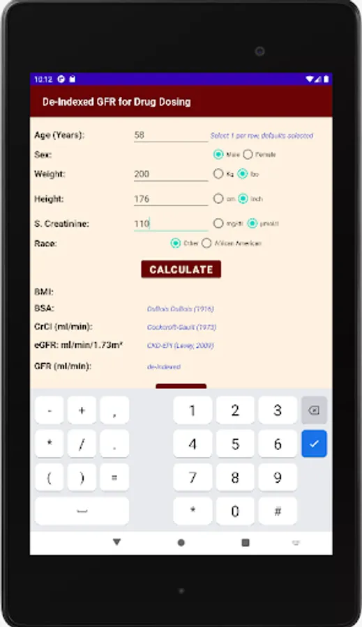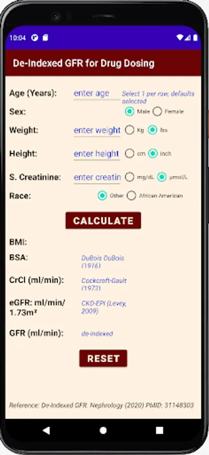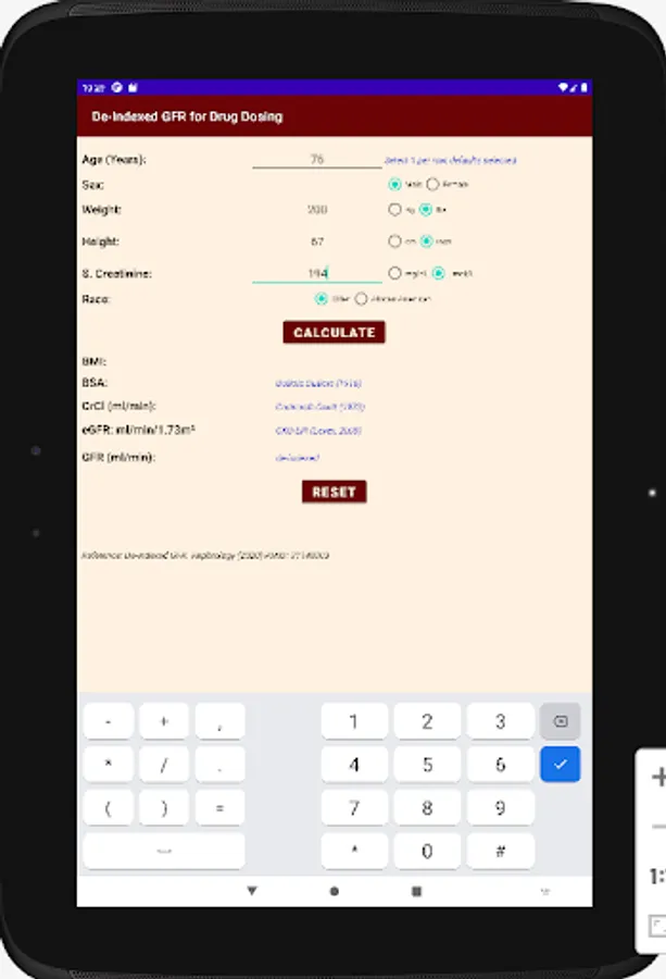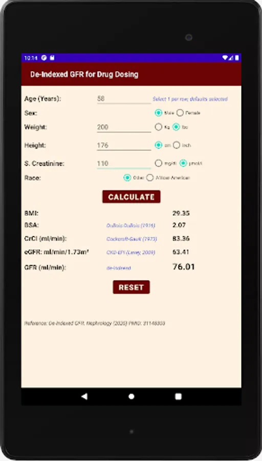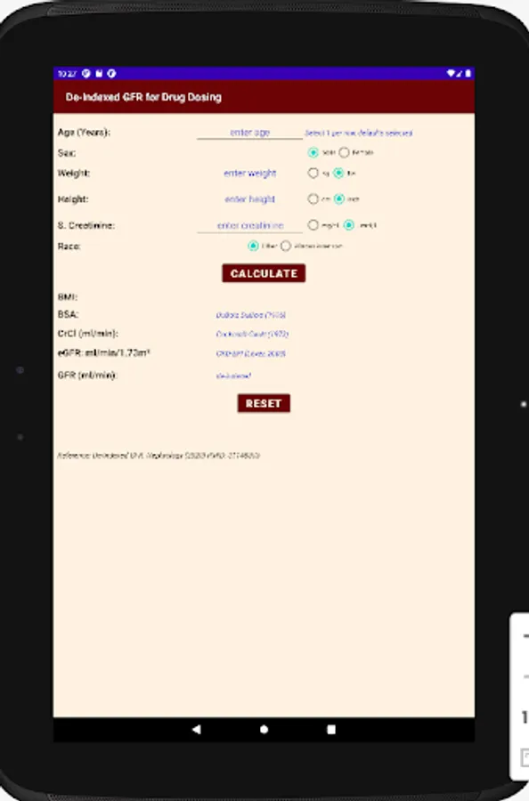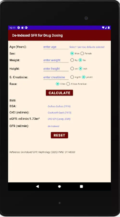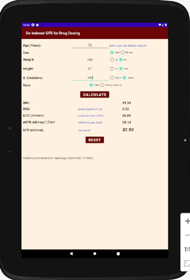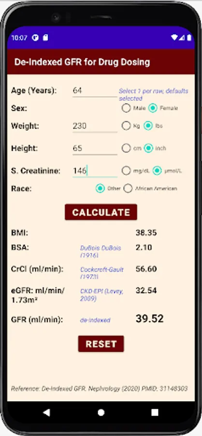 Accurate assessment of kidney function is crucial when medications that are excreted by the kidneys are used, to reduce their toxicity while maintaining their efficacy. Estimated glomerular filtration rate (eGFR) is underestimated in obese individuals when BSA correction is applied (as with, commonly used current CKD-EPI and MDRD equations), which may result in premature discontinuation of renally-excreted medications. In fact, when drug dosing is considered, the various regulatory bodies (Kidney Disease Improving Global Outcomes [KDIGO], European Medicines Agency [EMA] and Food and Drug Administration [FDA]) recommend a de-indexed eGFR (ml/min). De-indexing of eGFR should be considered in patients with moderate (BMI 35-40) to severe (BMI >40) obesity, to prevent unnecessary withholding or under-dosing of medications that are excreted by the kidneys. A Simple calculator is developed that provides calculated creatinine clearance (by Cockcroft-Gault formula) in ml/min, CKD-EPI eGFR in ml/min/1.73m2 and de-indexed GFR in ml/min. These three values on a single screen provides the health care provider a broader view of the individuals kidney function for optimizing drug therapy in such individuals.