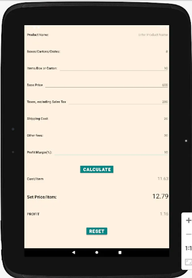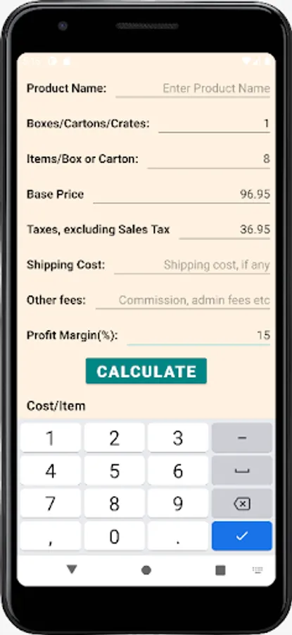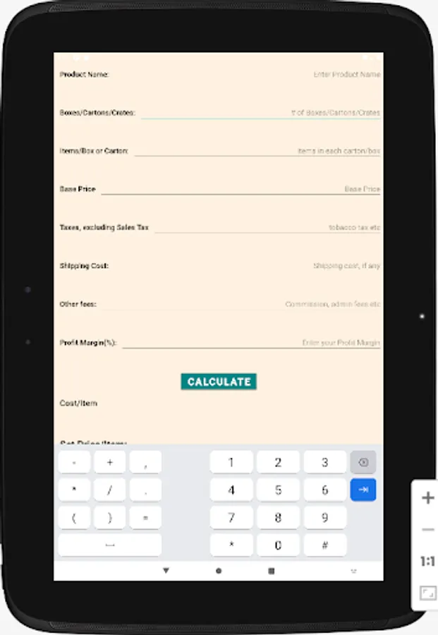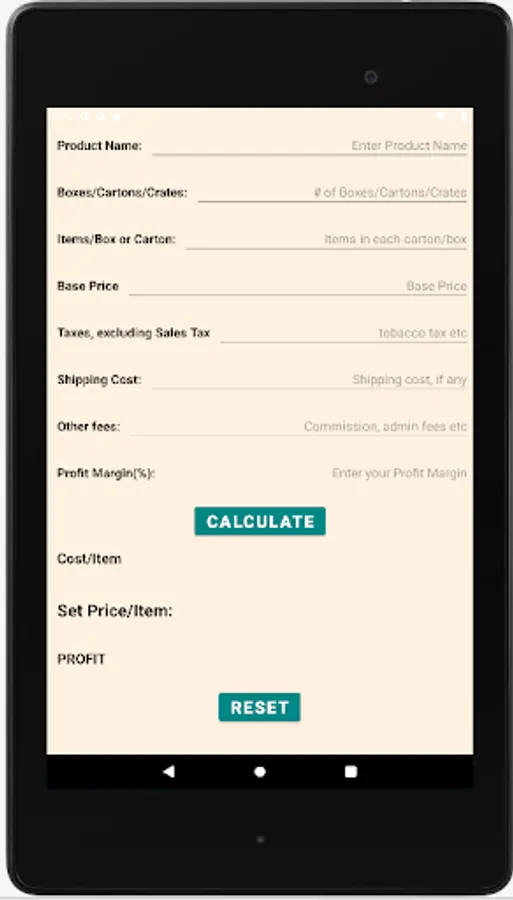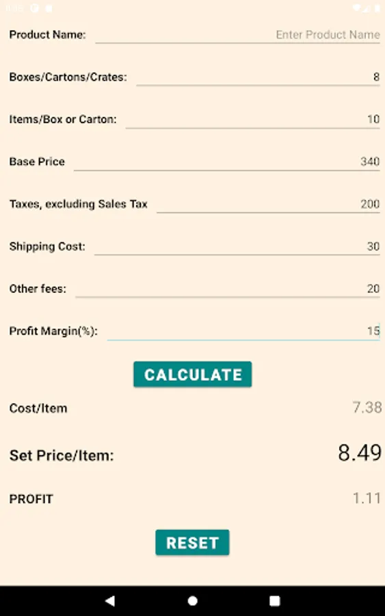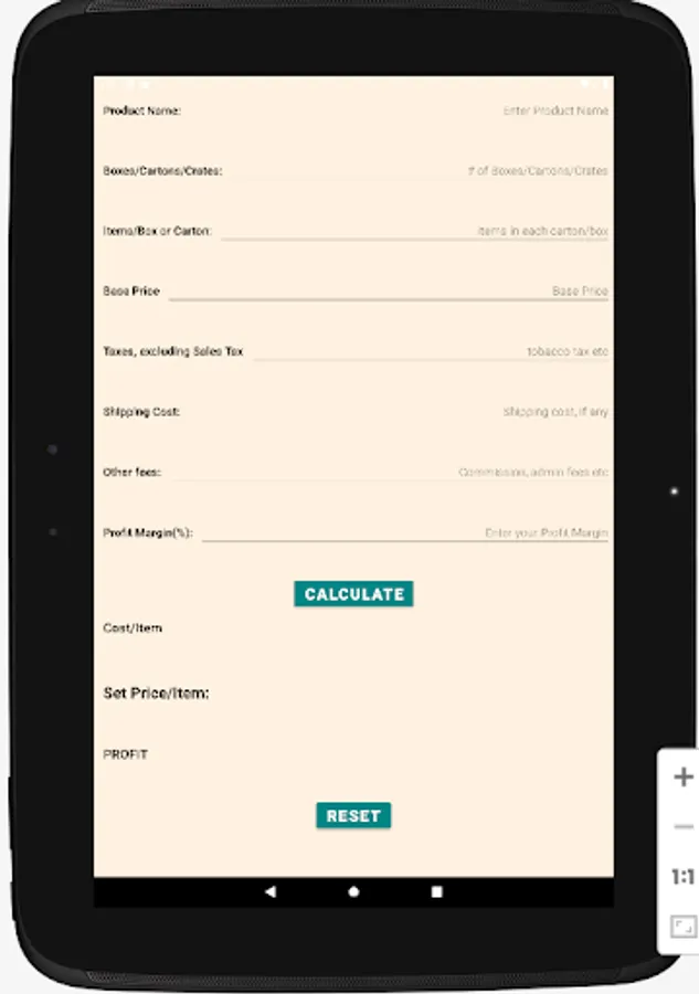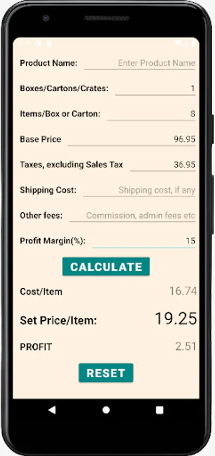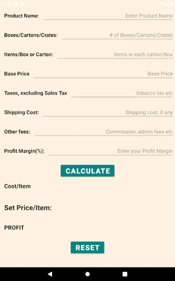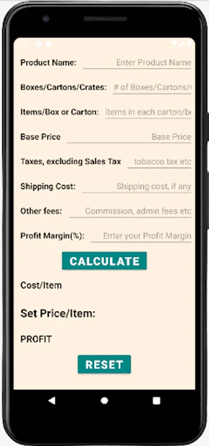 A simple, user-friendly calculator for retail stores (convenience stores, minimarts, gas stations and other retail outlets) to calculate the each item's cost including base price and other associated ancillary costs (shipping and handling, special taxes, like tobacco taxes - excluding sales taxes, admin fees, commissions), and then let the owner adjust the selling price after adding the desired percentage of profit margin on the item. Finally it provides the owner with the selling price and the net profit on that item and the owner can reset or readjust the selling price accordingly.