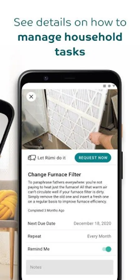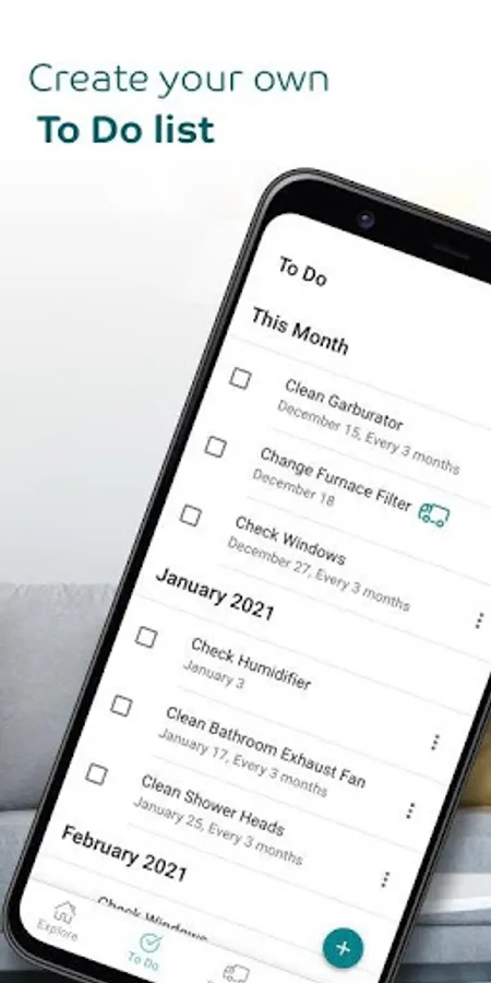 A robust list of 30+ maintenance suggestions lets you choose your own to-do list. Set notifications for the next time you'll need to check your weather stripping, inspect your deck or change your furnace filter. Keep your home safe and efficient, inside and out.