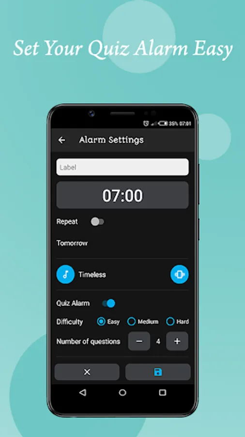 > if you choose a "quiz alarm clock" Toggle the degree of difficulty for questions: easy, medium or hard.