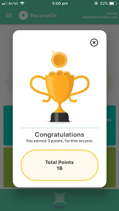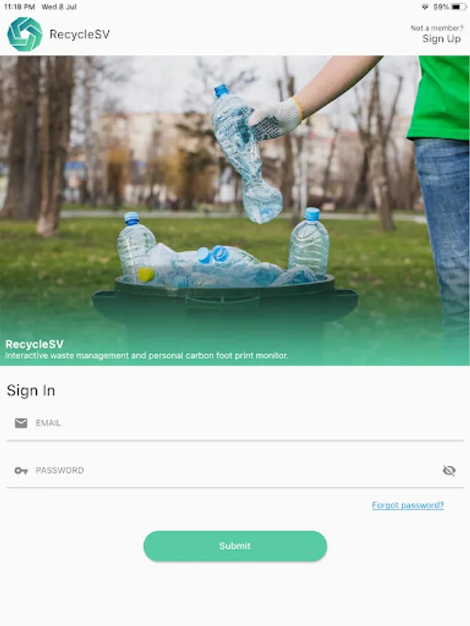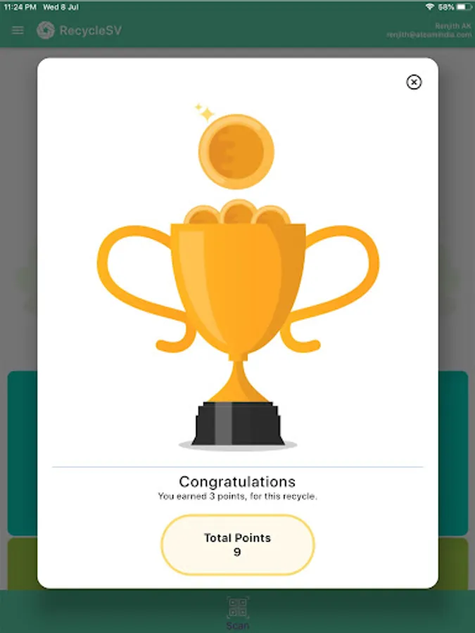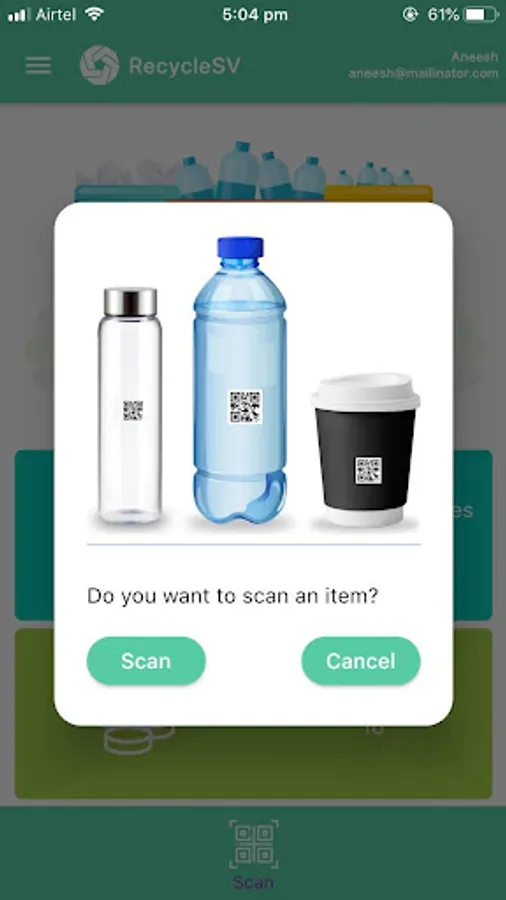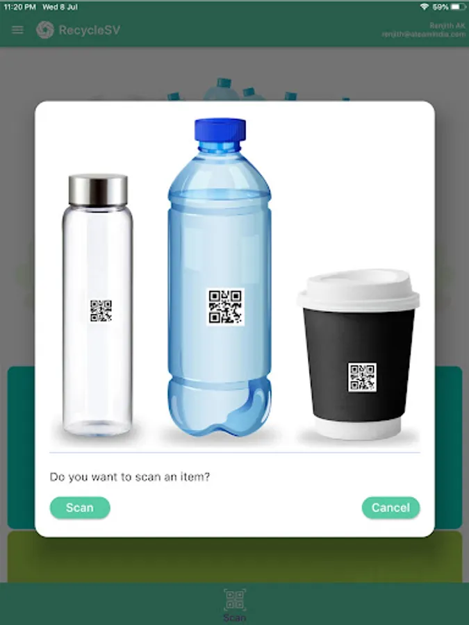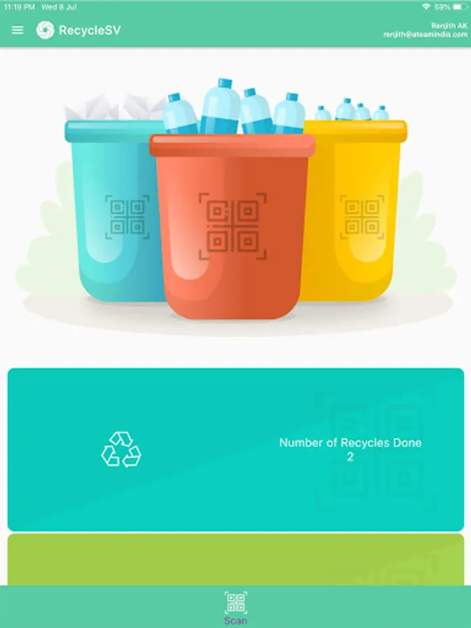 RecycleSV is a Mobile app that is in the testing phase. It allows you to scan an allocated QR code which then asks for you to take it to the bin, scan the bin QR code and recycle the item correctly. In doing so, you will receive (for now) a virtual reward. On logging in, it shall show your number of recycles and amount of rewards you have achieved. Dropping us an email at support@recyclesv.com is required to use the QR codes in the app.