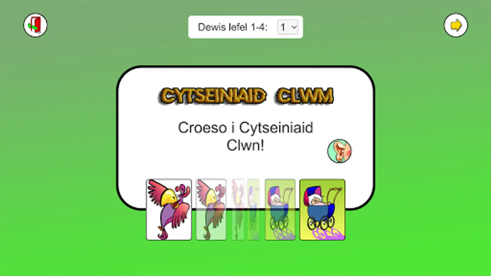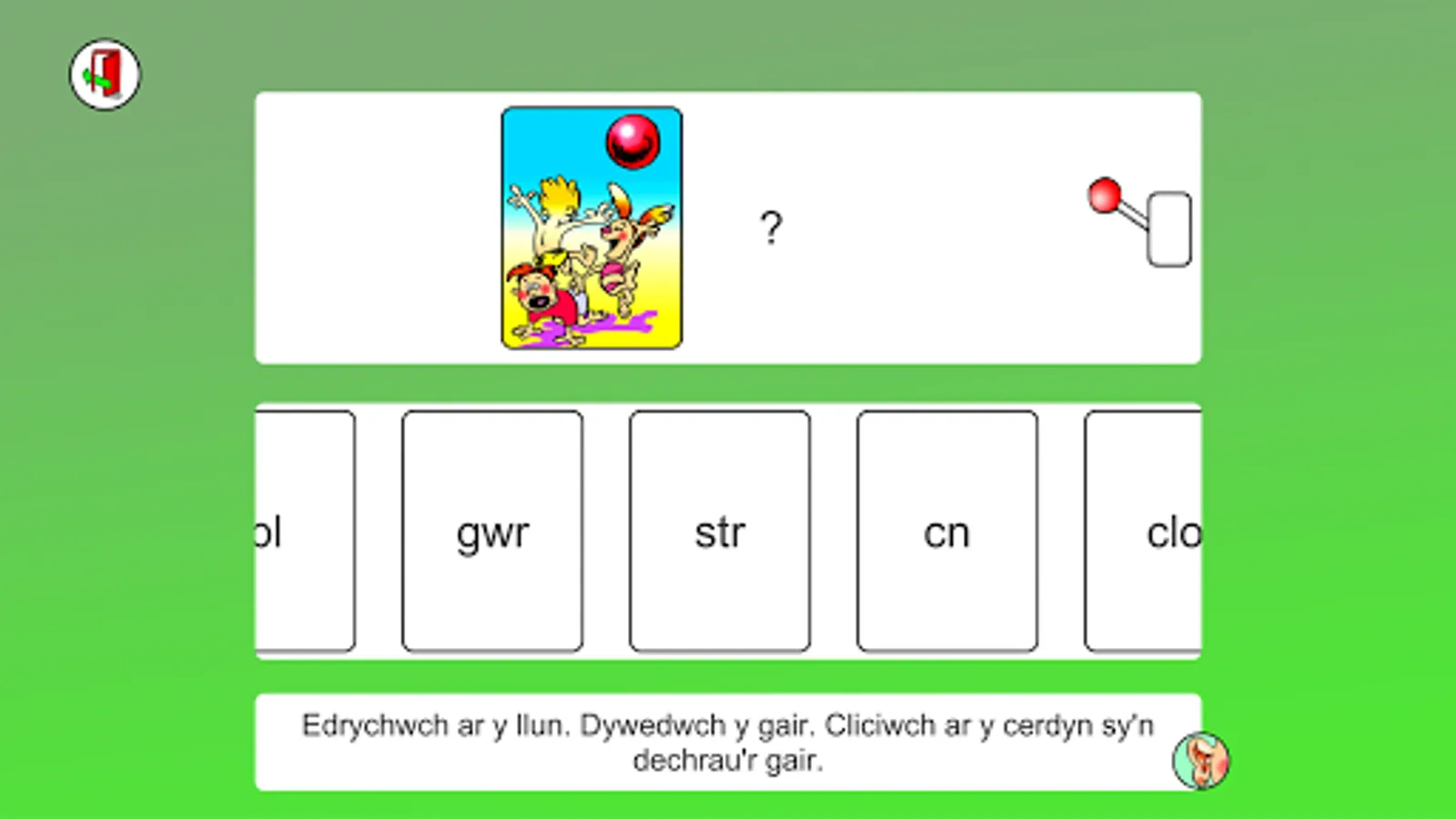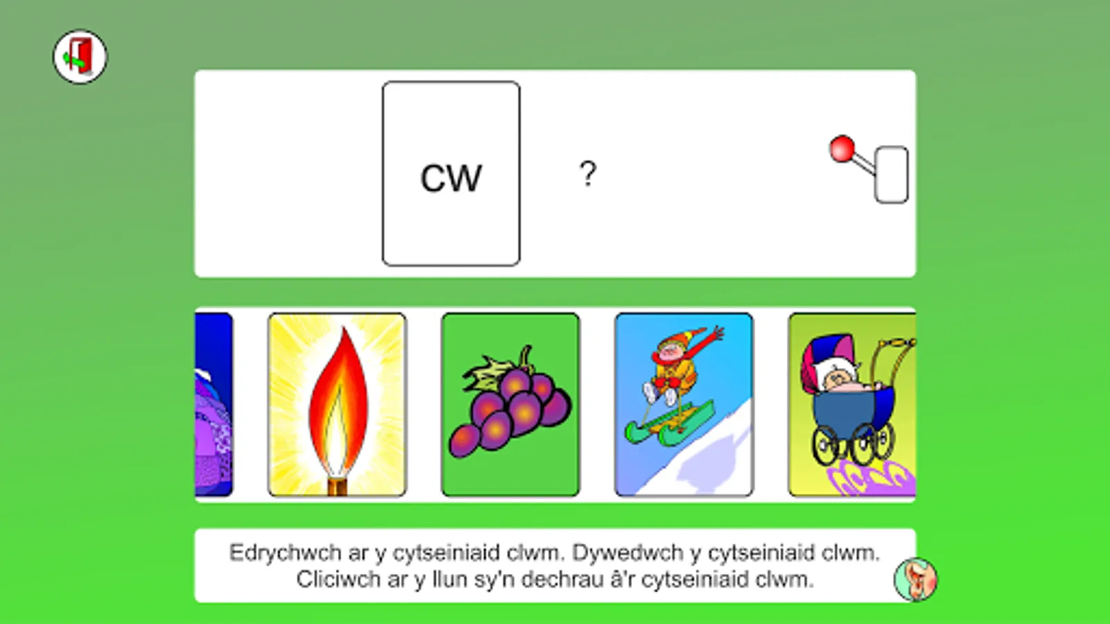 • Lefel 2 – Rhaid ynganu’r cytseiniaid clwm. Yna, rhaid edrych ar y carwsél o gartwnau, dewis y cartŵn sy’n dechrau â’r cytseiniaid clwm a’i dapio.
