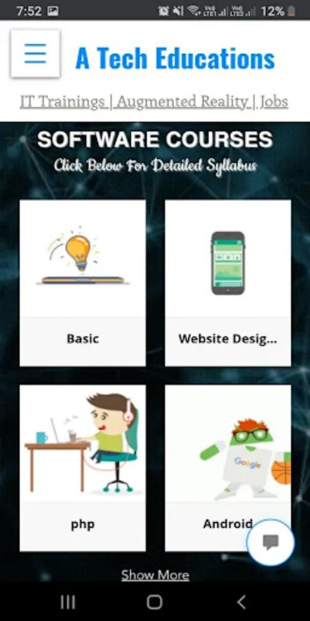 It contains courses such as Basic Computer Training, Website Development, Android App Development, Software Development and Augmented reality