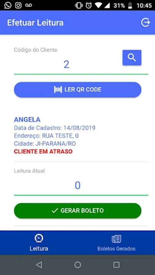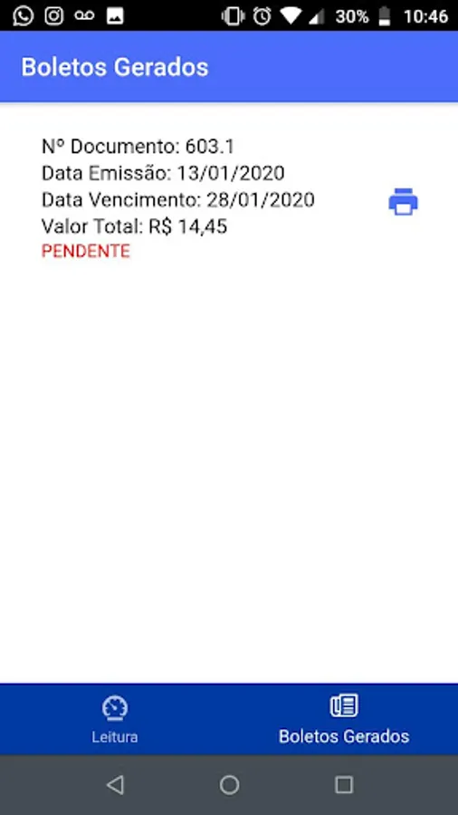 This app reads gas consumption by measurement performed by the user. After measuring the gas consumption performed by the consumer unit, a bank slip is generated in bluetooth printer for delivery to the customer.