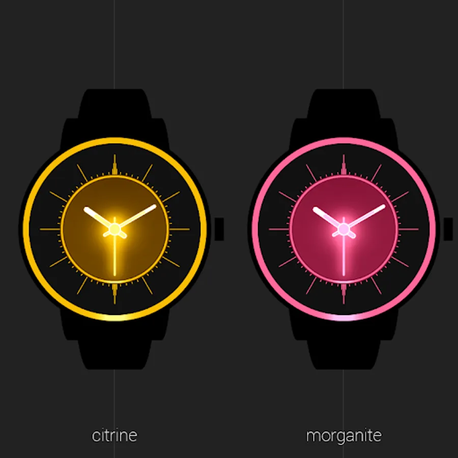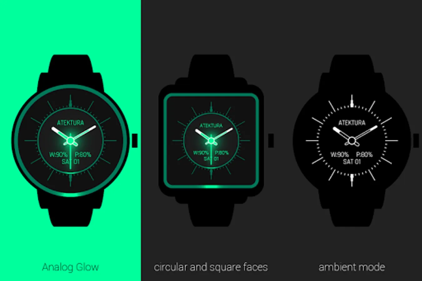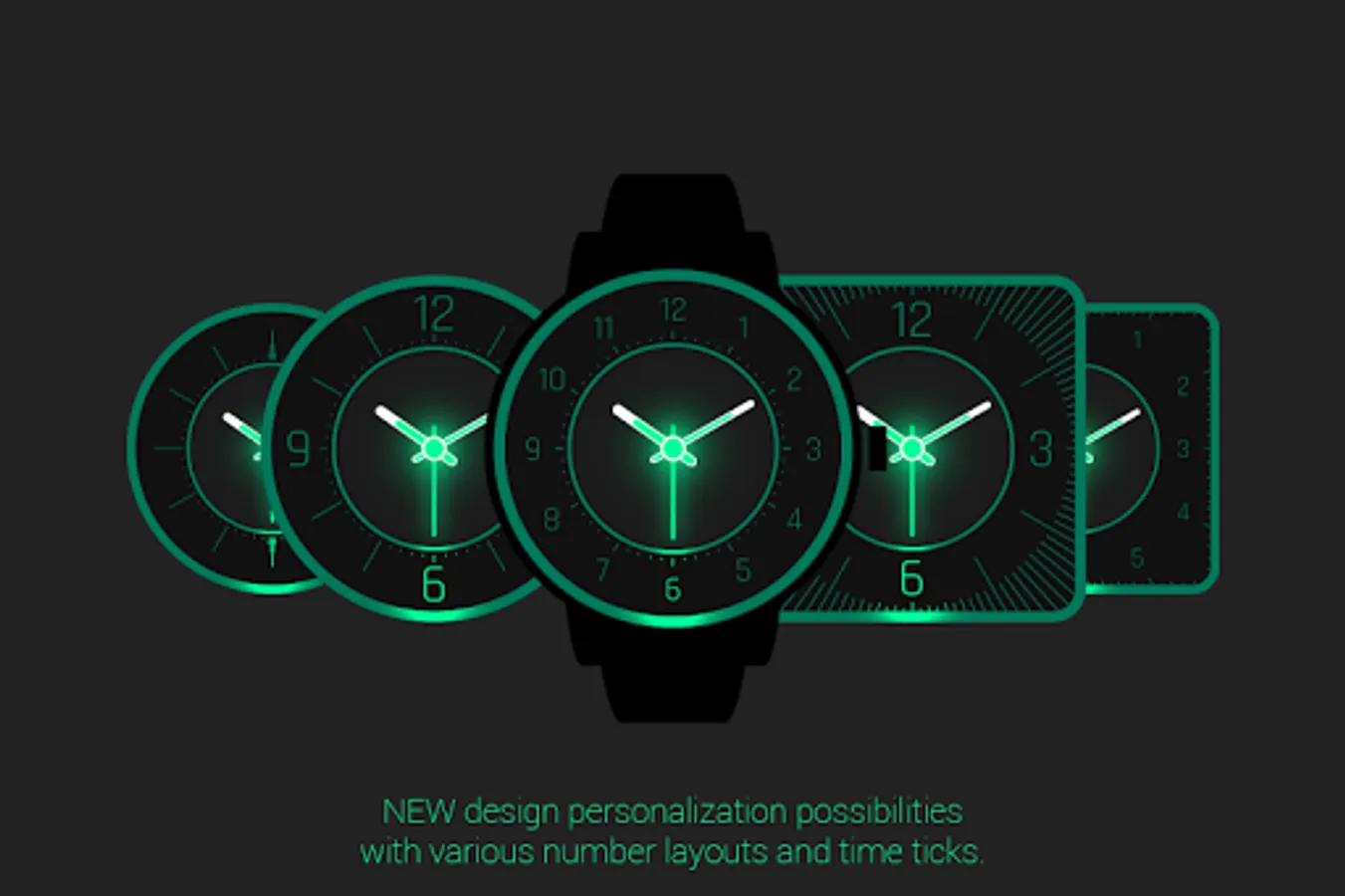 Analog watch face with a beautiful illumination and 9 unique color skins: