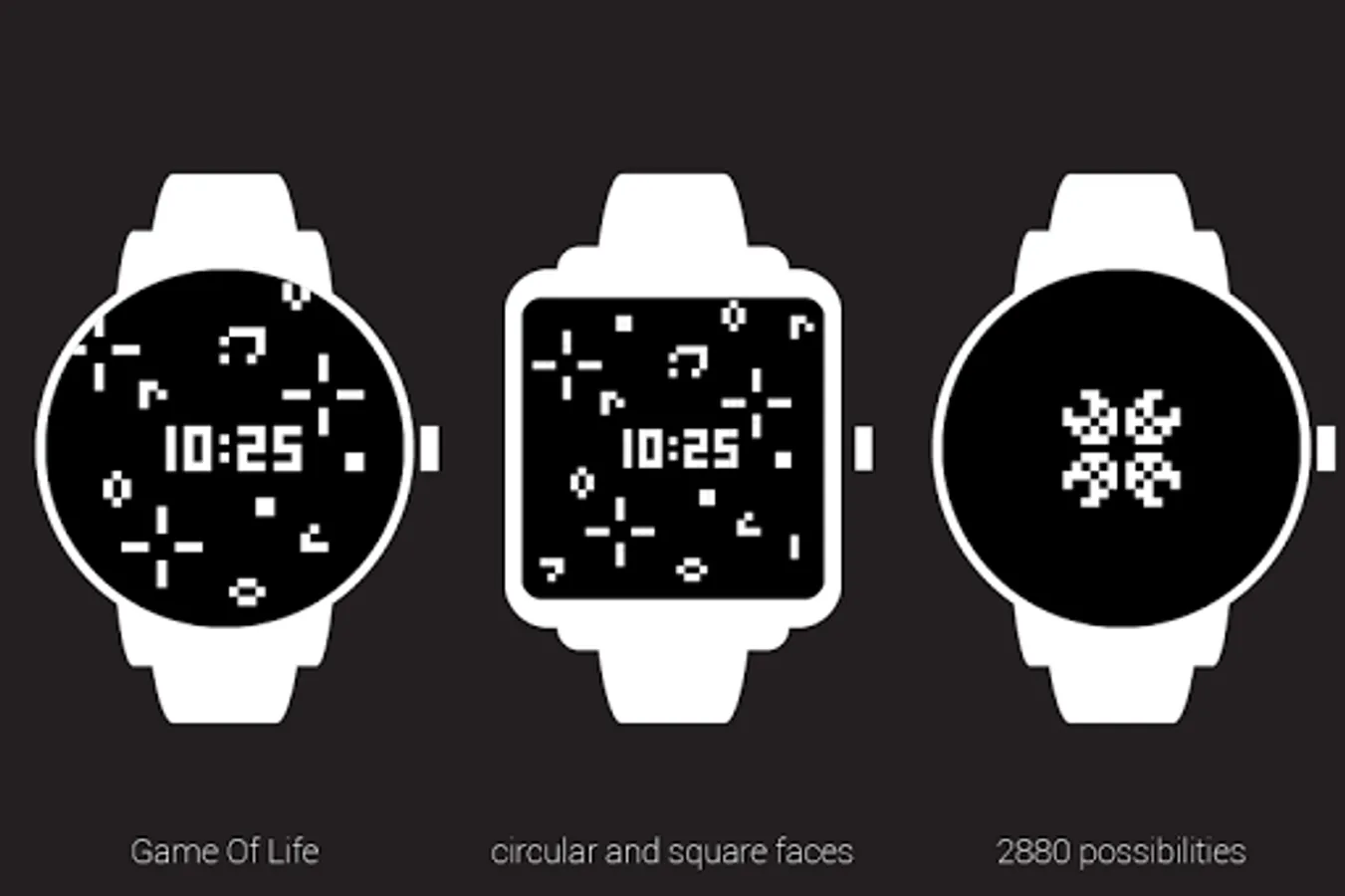 This watchface uses simple Conway's algorithm to process pixelated time representation, giving you 2880 different, fascinating transformations.