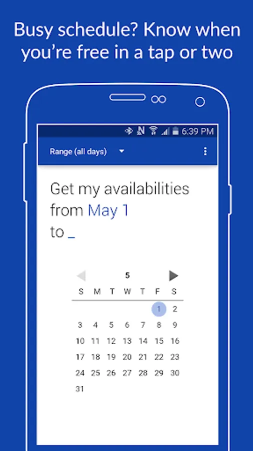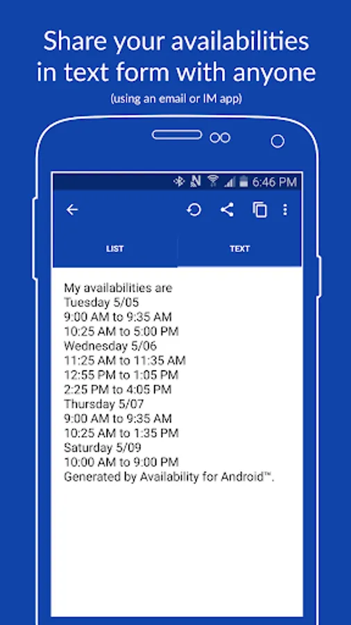 Simply select the dates you wish to meet, and Availability will analyze your calendar and pick out your free time. With just a few more taps, you can send your availabilities over to your colleague or friend.