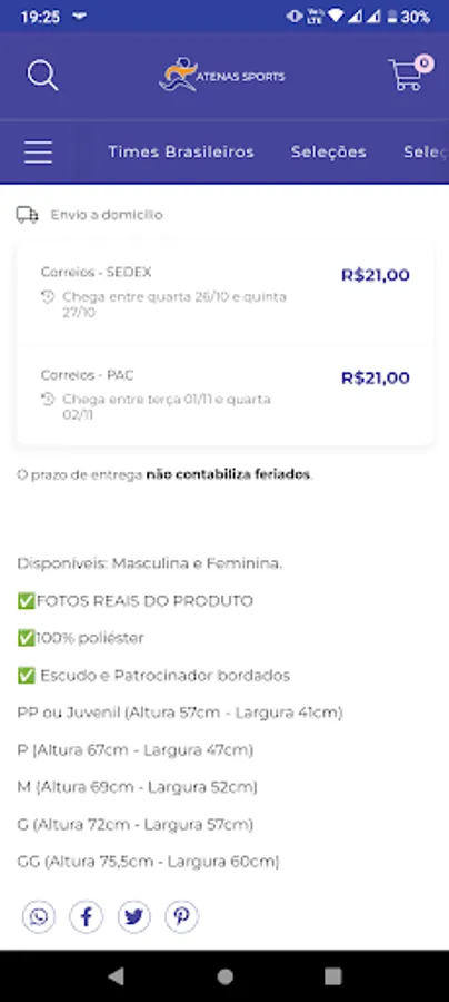 Welcome and welcome to our store. We sell sporting goods, especially football and basketball jerseys and shorts. We ship the products to any part of Brazil.