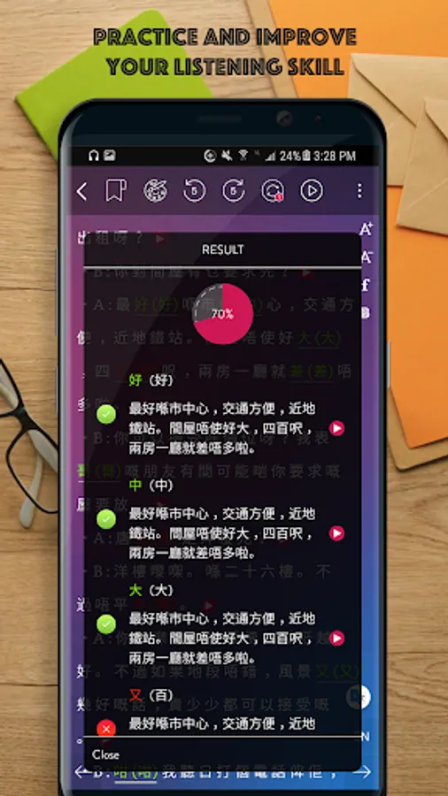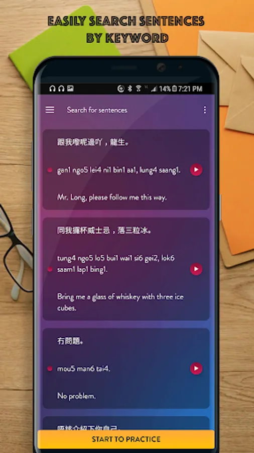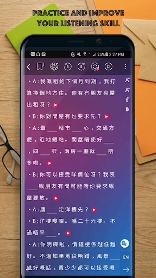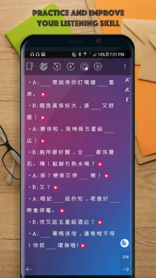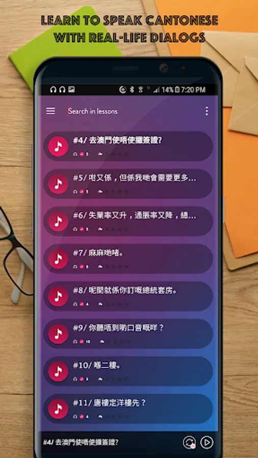 The app is designed with a question in mind - How to help users quickly open the lesson and no need to constantly keep the app open. Just tap the Play button and exit the app, turn off the screen, and focus on listening. So it is very useful for you to learn when you are driving.