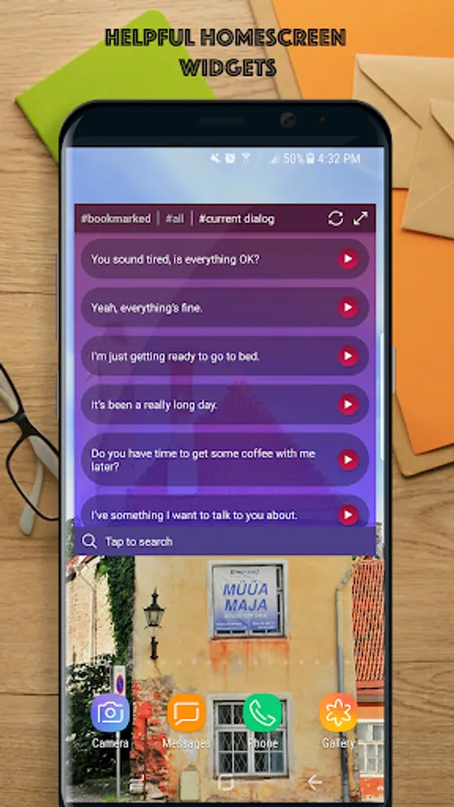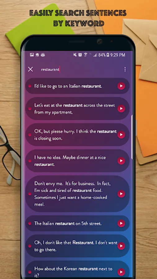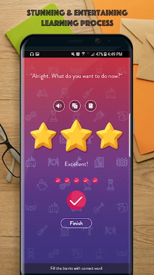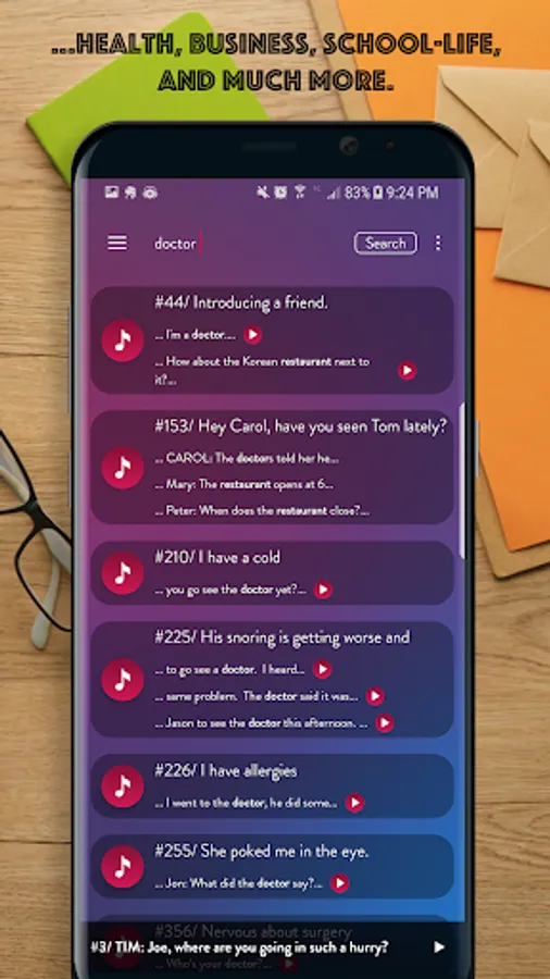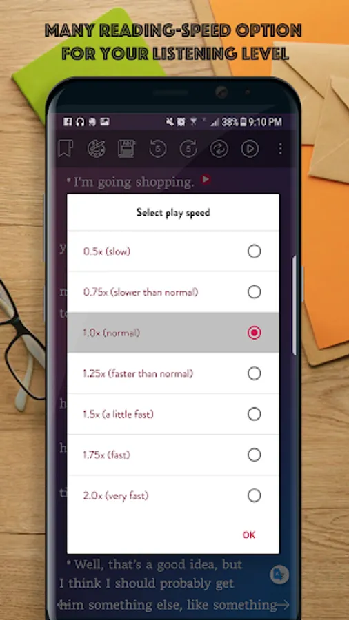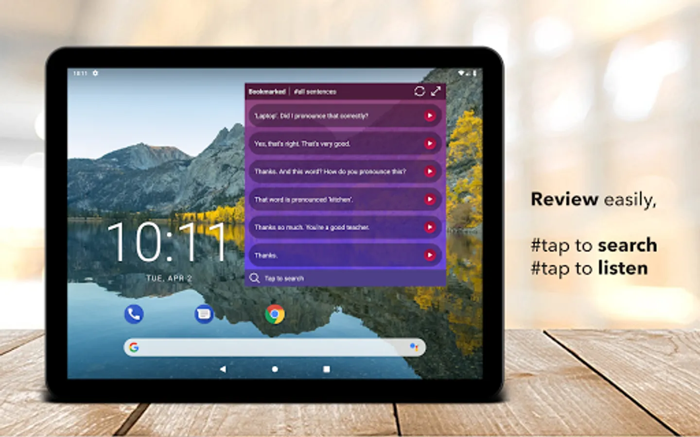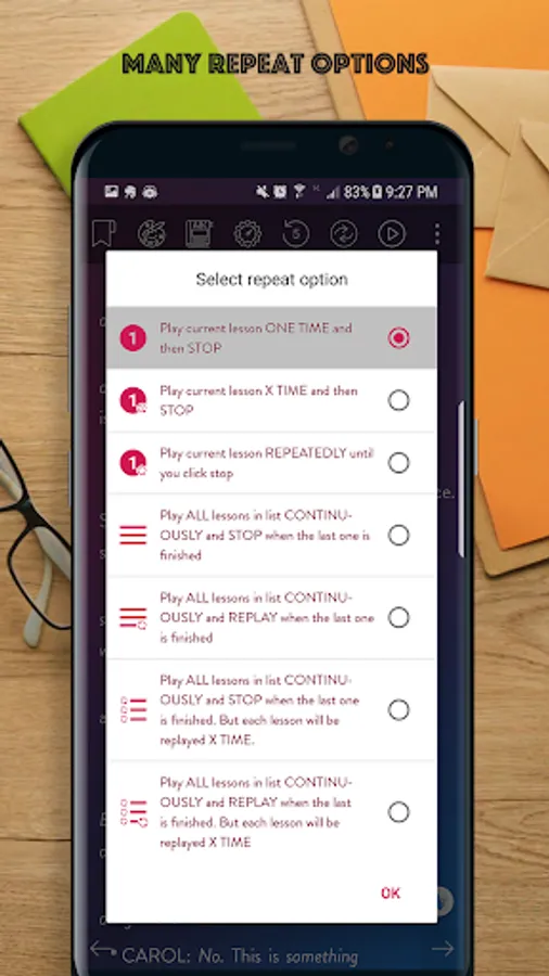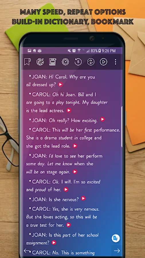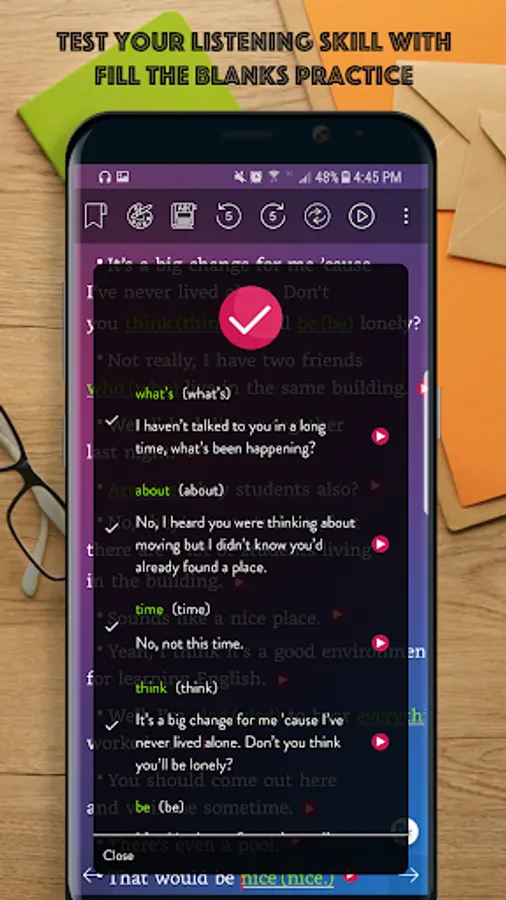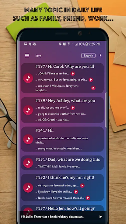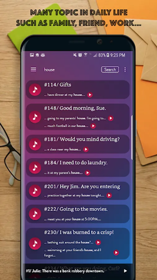 The app is designed with a question in mind - How to help users quickly open the lesson and no need to constantly keep the app open. Just tap the Play button and exit the app, turn off the screen and focus on listening. So it is very useful for you to learn when you are driving.