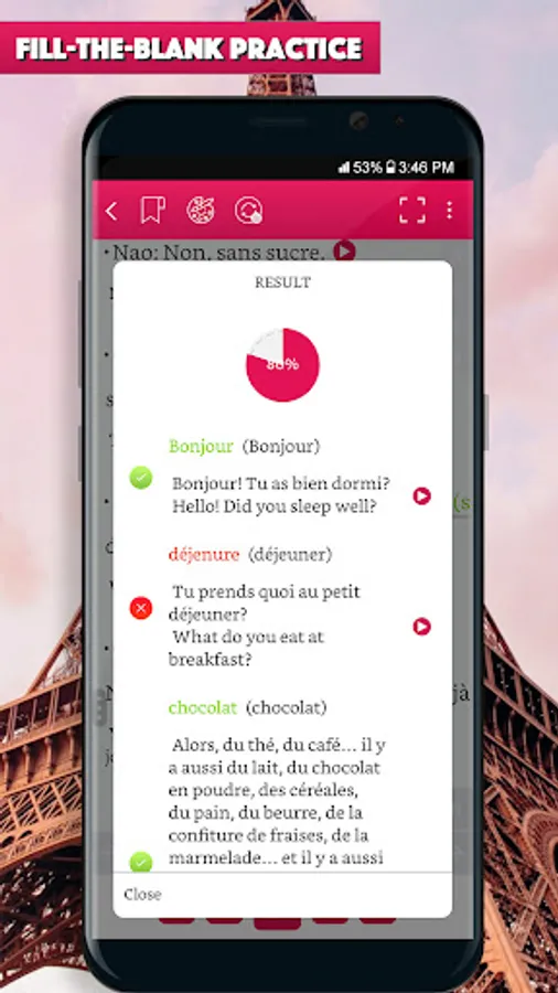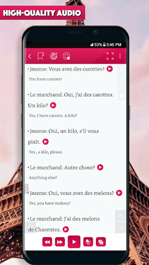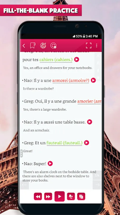Lesson’s script is prepared in French and English side-by-side (just swipe life to, help you quickly look up for new vocabulary and understand the context.