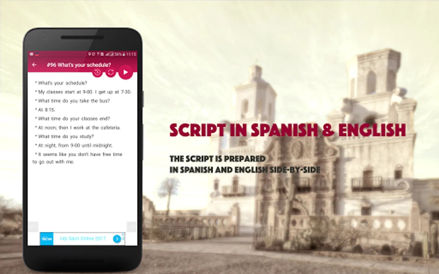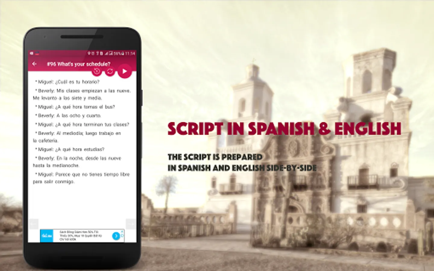 Lesson’s script are prepared in Spanish and English side-by-side (just swipe life to , help you quickly look up for new vocabulary and understand the context.
