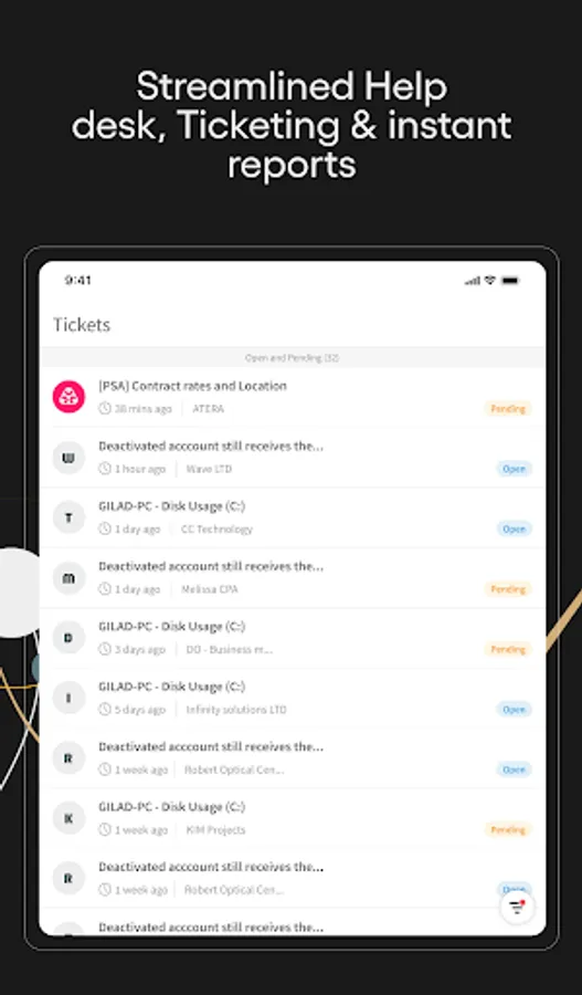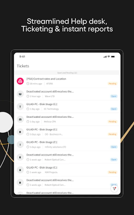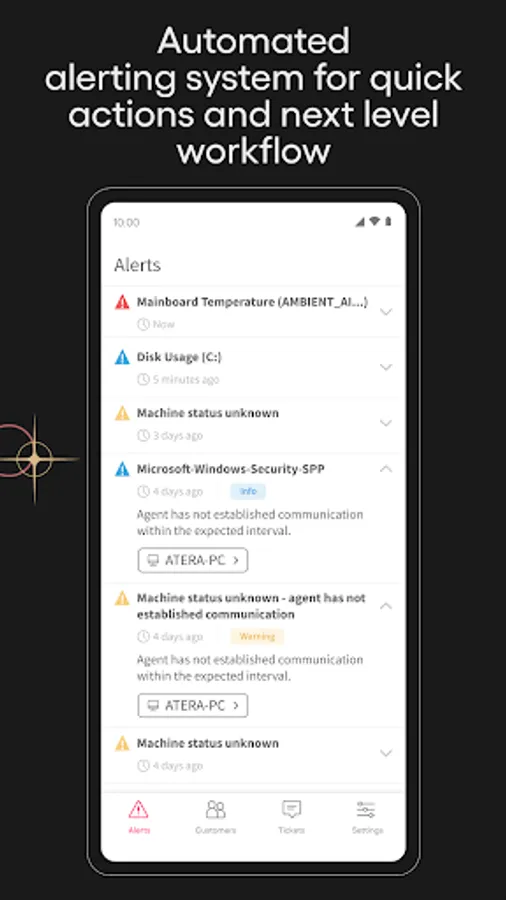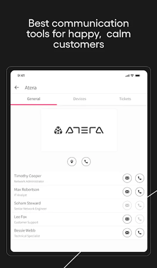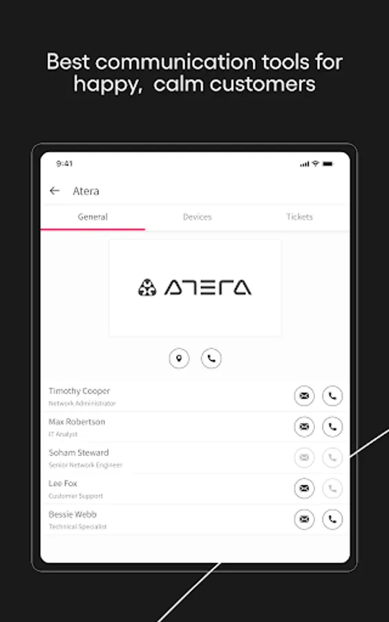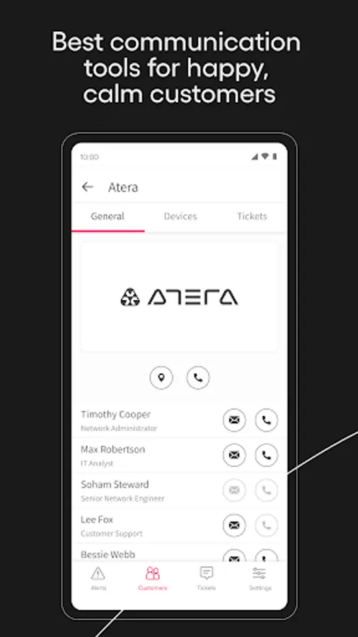 Introducing the Atera mobile app! Provide awesome IT support to your customers, at the office, on-site, and on-the-go, with alert monitoring, access to customers, contacts and devices, remote access, and more.