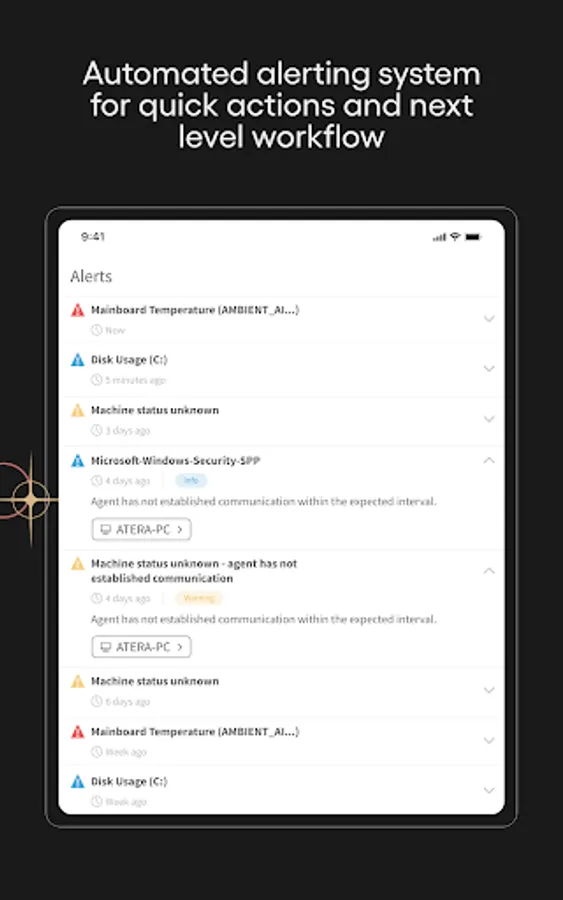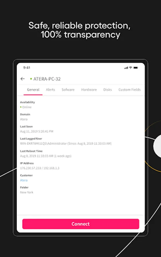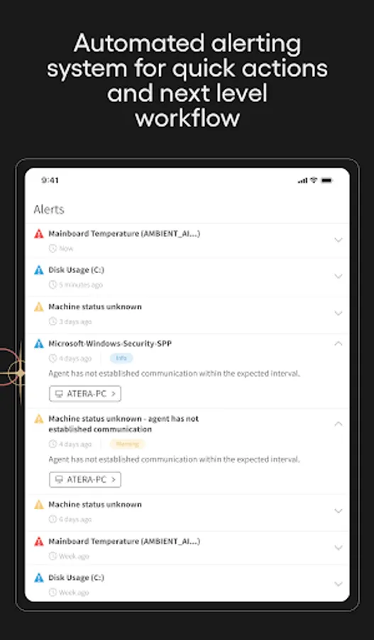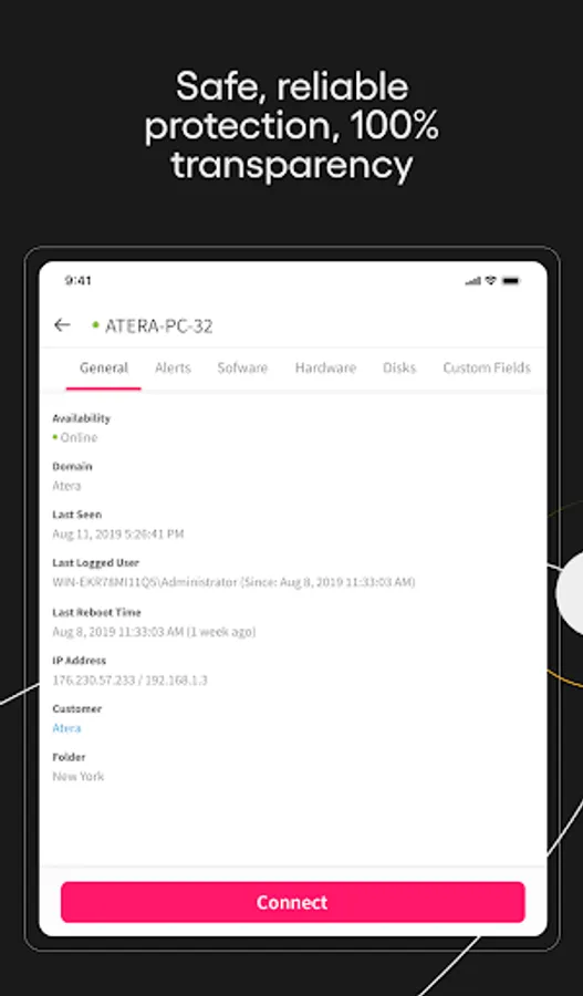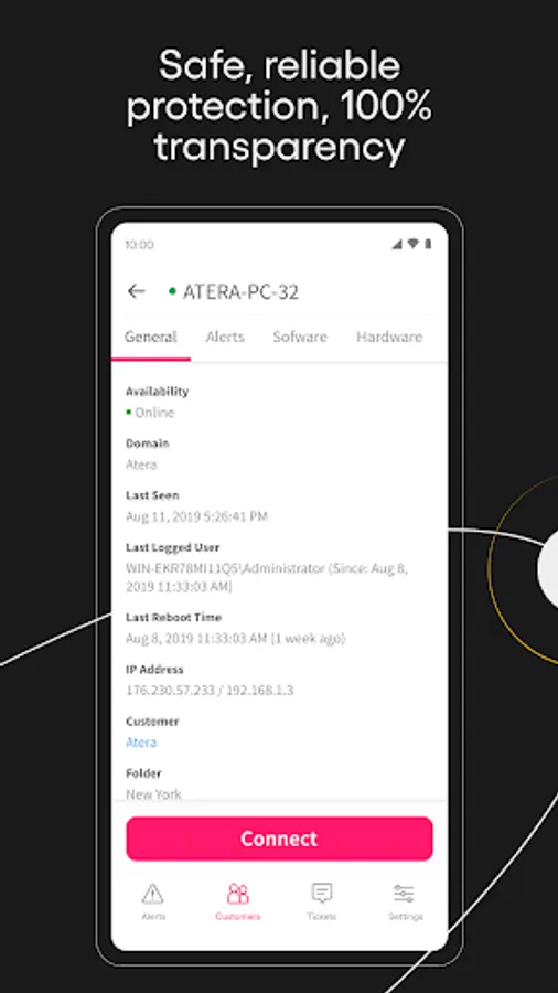 Atera is a unique platform designed for Managed Service Providers (MSPs) and internal IT departments; Combining Remote Monitoring and Management (RMM), Help Desk, Remote Support, Billing and Reporting —it’s a complete, one-stop-shop that enables MSPs to manage their entire business. The mobile app is a lite version designed to be used alongside Atera software.