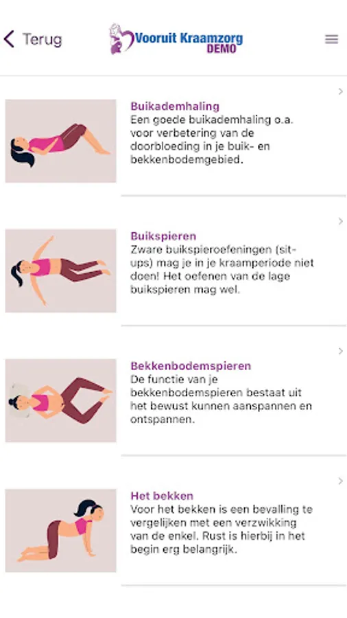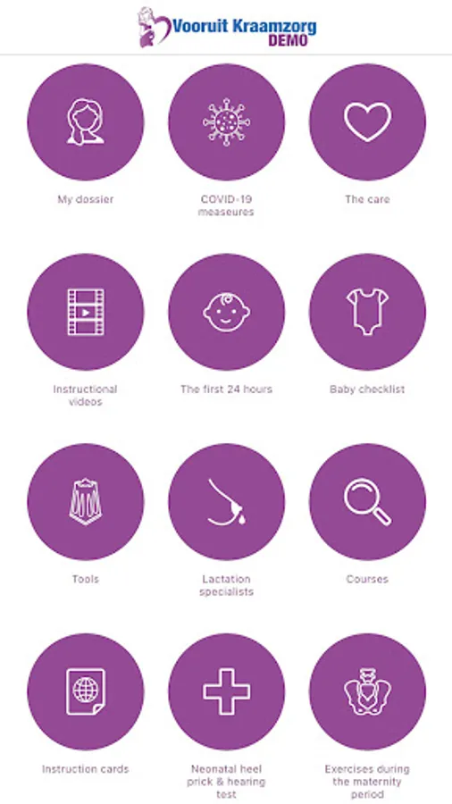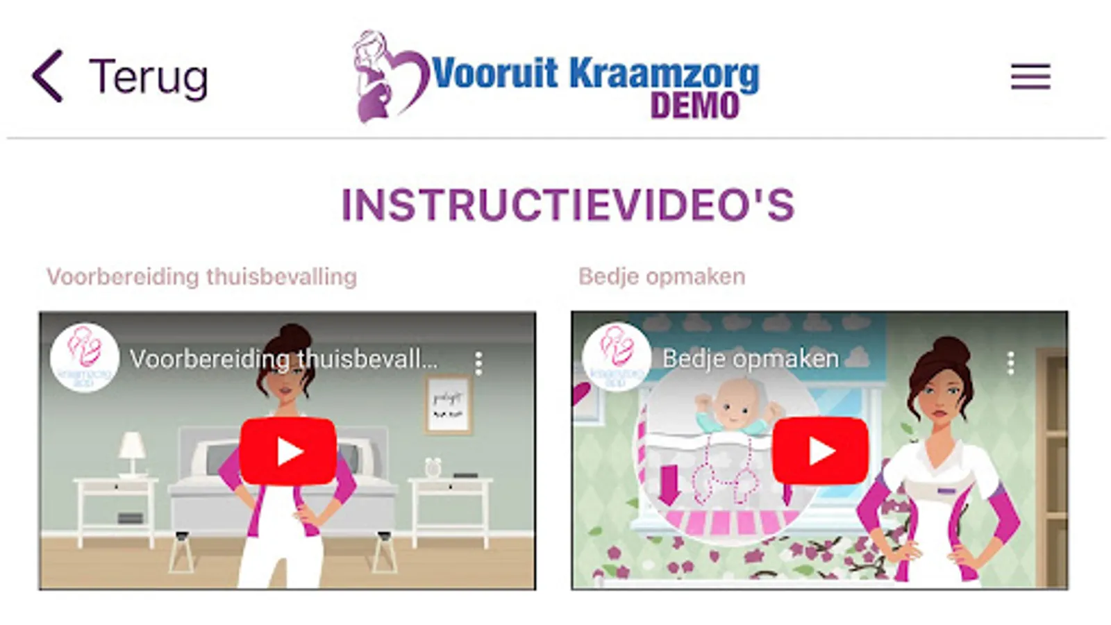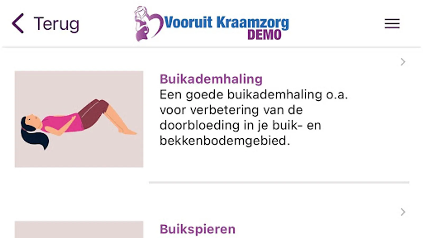 In this free App for (future) parents you have all useful information about the maternity week at hand. From a list to useful tips, from exercises to all kinds of fun pregnancy courses and from clear instruction cards to exclusive instruction videos, it is all available 24/7 in the Maternity Care App.