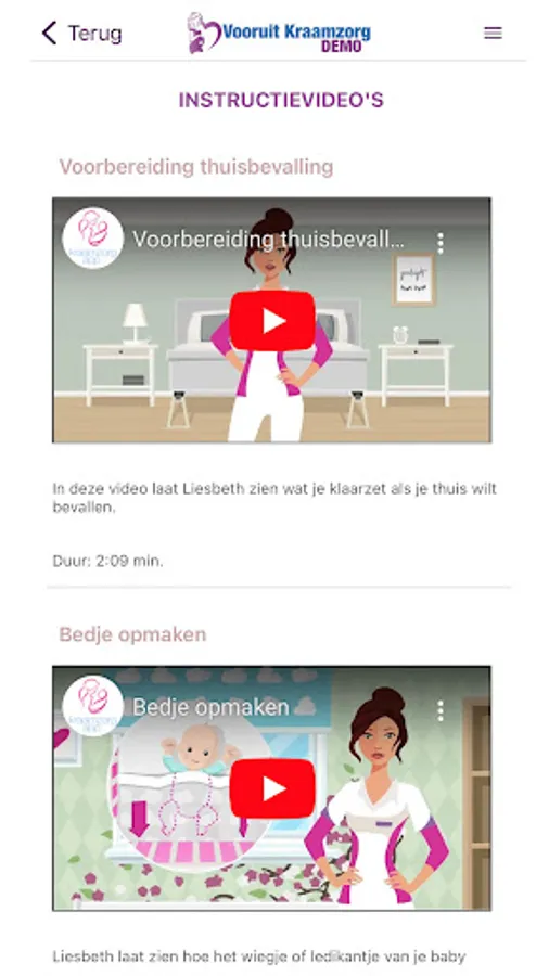 Handy information, useful tips and clear instructional videos to prepare for, during and after the maternity week.
