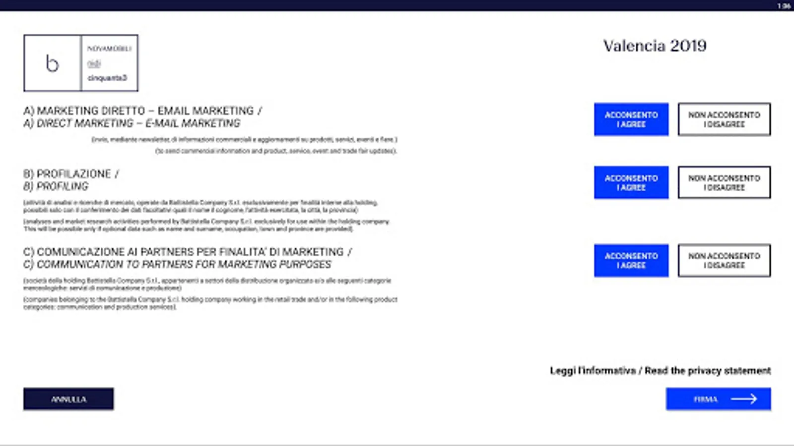 The app allows both the acquisition of information relating to privacy and the display of data relating to the stores and agents of the Battistella group.