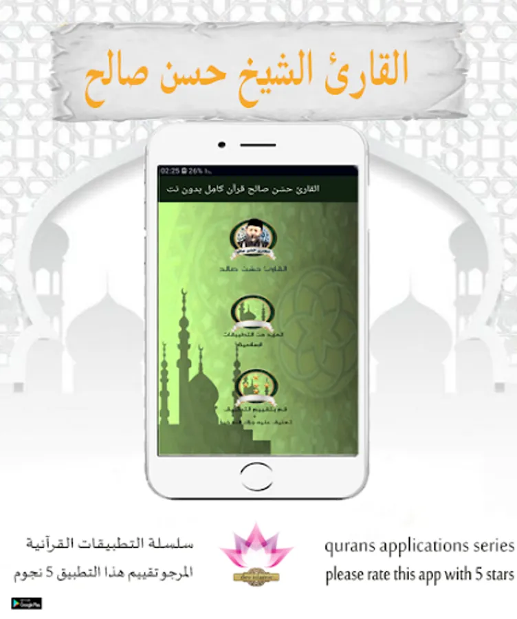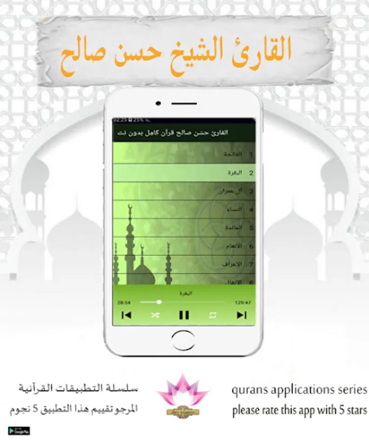 We present to our esteemed users this new application, which is for the reader, Sheikh Hassan Saleh, it works without the Net easy to use and the sound quality is very excellent as it includes a large group of wonderful things in addition to an easy interface as we hope that you like it