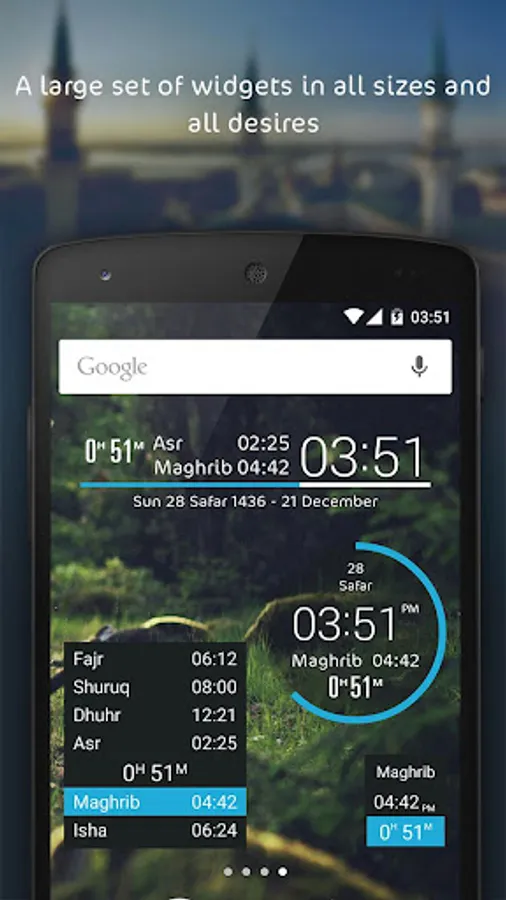 - 5 different widgets to display all prayer time or next prayer time with remaining time , clock time , iqama time, hijri date .