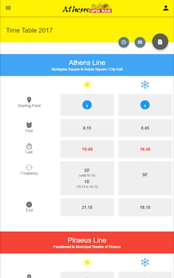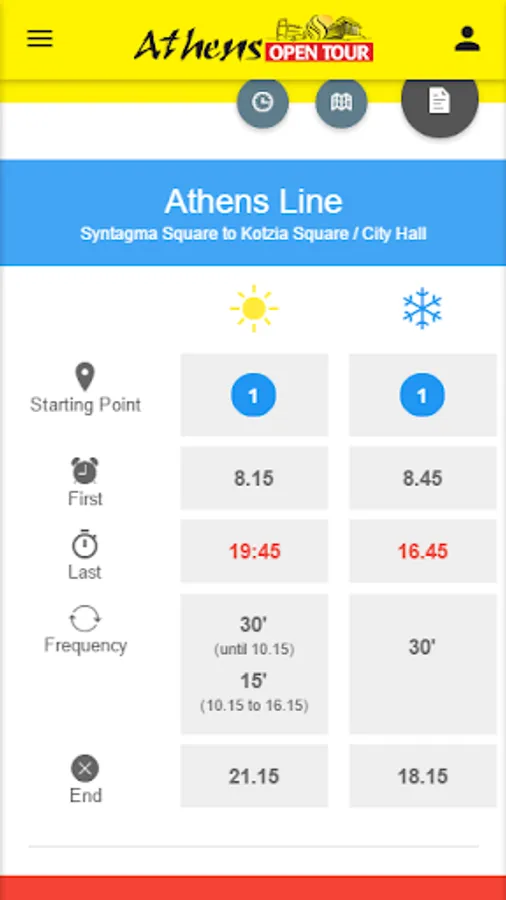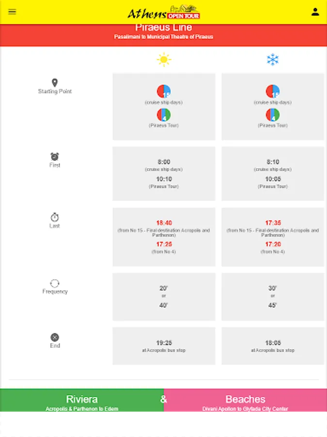 Athens Open Tour operates all year round. Our Athens, Piraeus, Riviera & Beaches tours run daily with a 15-30 minute frequency time schedule from 08.00 until 20.00 during the summer season April to November and from 09.00 until 17.45 during the winter season December to March. With our 90 minute Athens Route Terminal located at Syntagma Square, our 60 minute Piraeus Route starting point at the Cruise Ships Terminal and our Interchange bus stop at the Acropolis, our tourist-friendly city tours ideally cover all the major sights and attractions.