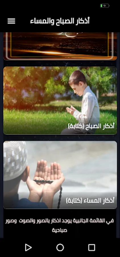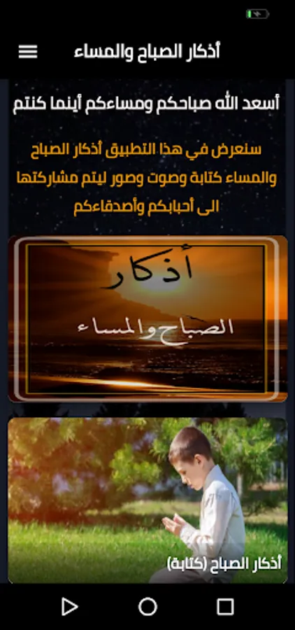 اليكم اهم الادعية نقدمها لكم عبر مقاطع صوتية بشكل واضح ودقيق وجودة عاليه وذلك من خلال اتصالك بشبكة الانترنت (online) وهذا يغنيك بالفعل عن البحث عن الادعية في مواقع اخرى قد لا تجمع رغباتك وكل هذا نوفره لكم في تطبيق Morning and Evening Prayers(اذكار الصباح والمساء) وقد تضمن ايضا تطبيق Morning and Evening Prayers(اذكار الصباح والمساء) أدعية الصباح والمساء وصور صباحية ومسائية حرصنا في تطبيق Morning and Evening Prayers(اذكار الصباح والمساء) على تصميمه بالشكل العصري الجميل والممتع كما يمكنك التنقل بين الادعية وايقافها بكل سهوله ويمكنك مشاركة التطبيق مع افراد عائلتك واحبتك لا تتردد بتحميل تطبيق Morning and Evening Prayers(اذكار الصباح والمساء) واستخدام موفق لك