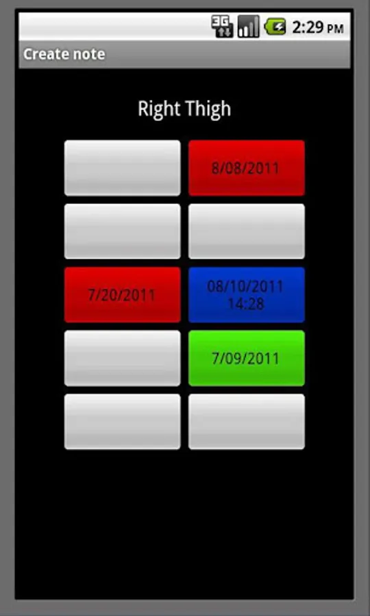 Touch the Menu key to add a note. The app will automatically save the notes and the injection site when you go back to the main screen. If you need to make a note of an event that happened in the past, you can set a date, which would be a new date for the record. If the date is not set manually, it would be set automatically as a current date on the Mobil device.