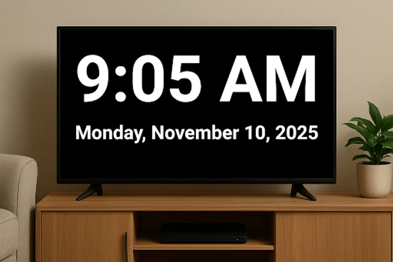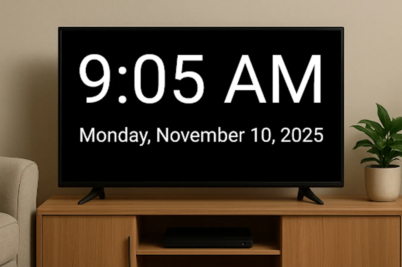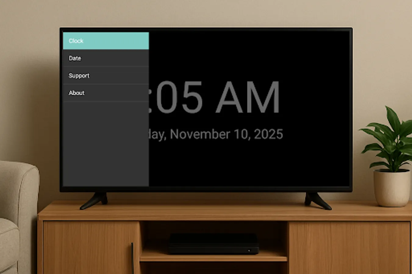The screen of our television displays the time, date, or both the time and date. Text size is adjustable. Seconds can be displayed. Bold text is available. It is easy to use. The application size is small.