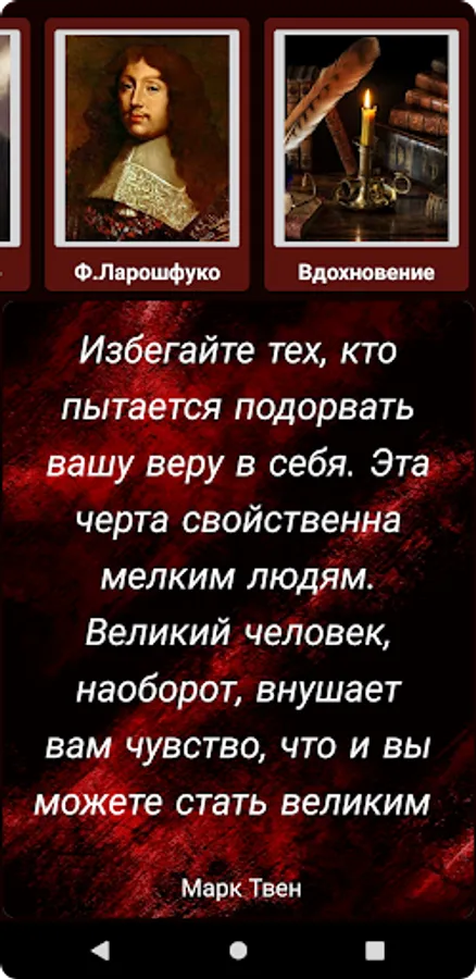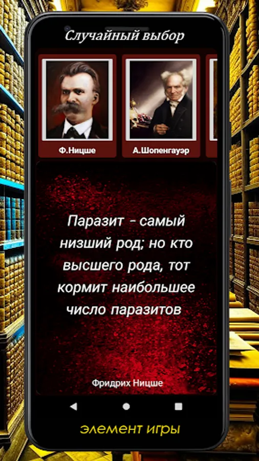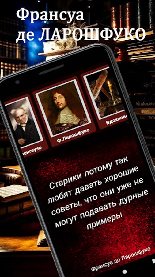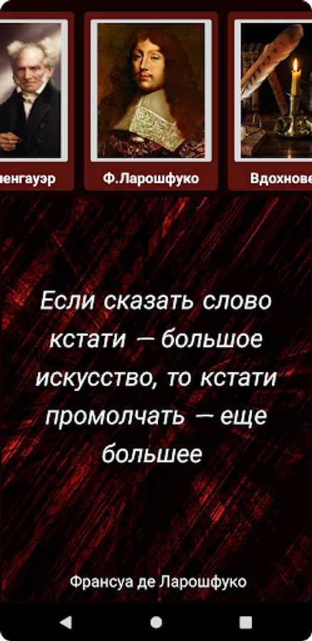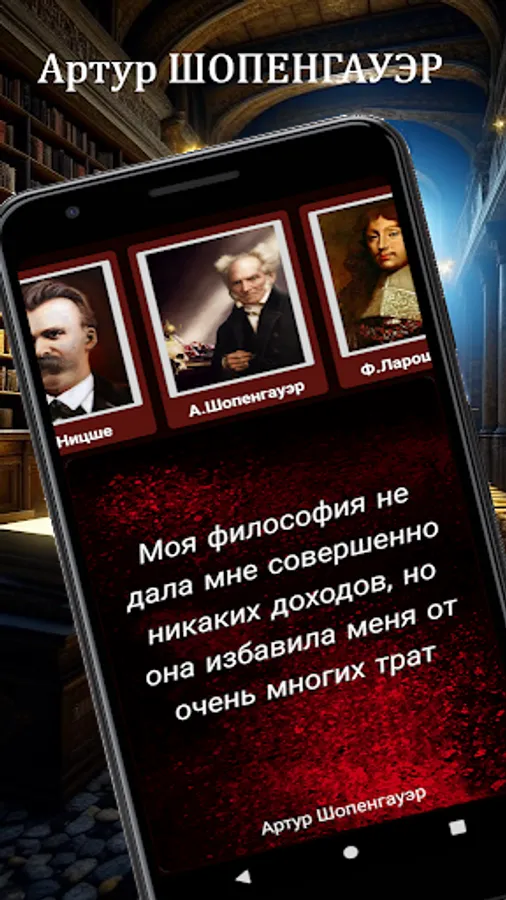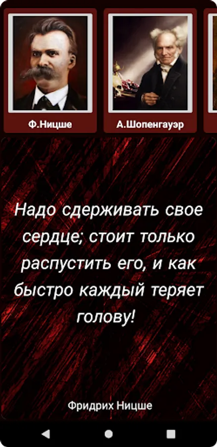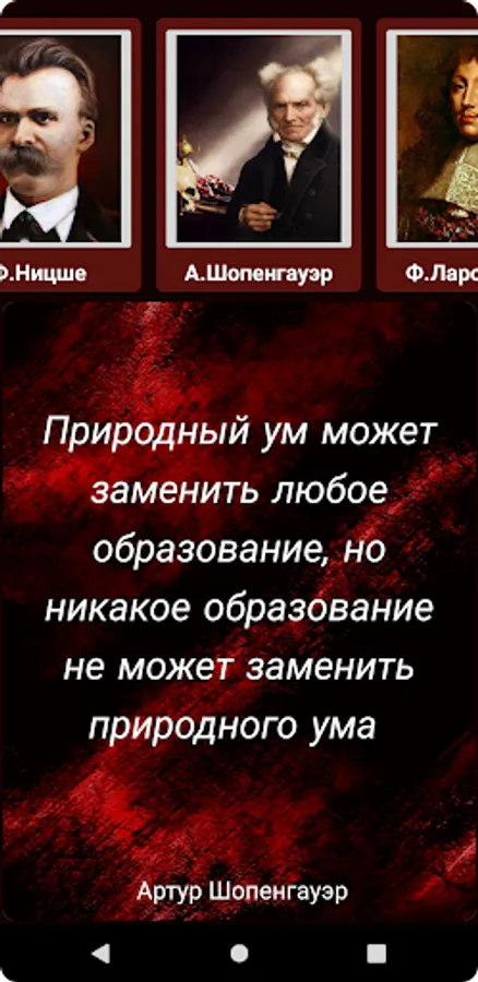 Looking for a source of inspiration and wisdom, but do not always have enough time to read books? Then our app is perfect for you! The selected quotes contained in it by F. Nietzsche, A. Schopenhauer, F. La Rochefoucauld and many other authors will help you find answers to your questions and give you new ideas for reflection. More than 700 quotes are collected in a convenient application that can work even without an internet connection. By selecting the appropriate category, the quotes appear randomly, giving your search for wisdom a playful element. Don't miss the opportunity to get a dose of inspiration right on your mobile device!