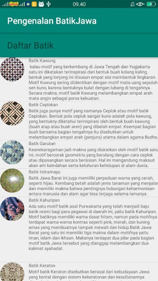This application introduces various kinds of batik, especially in Java province. Such as Batik megamendung, batik sekarjagad and others.