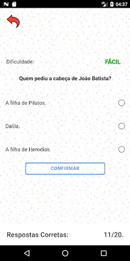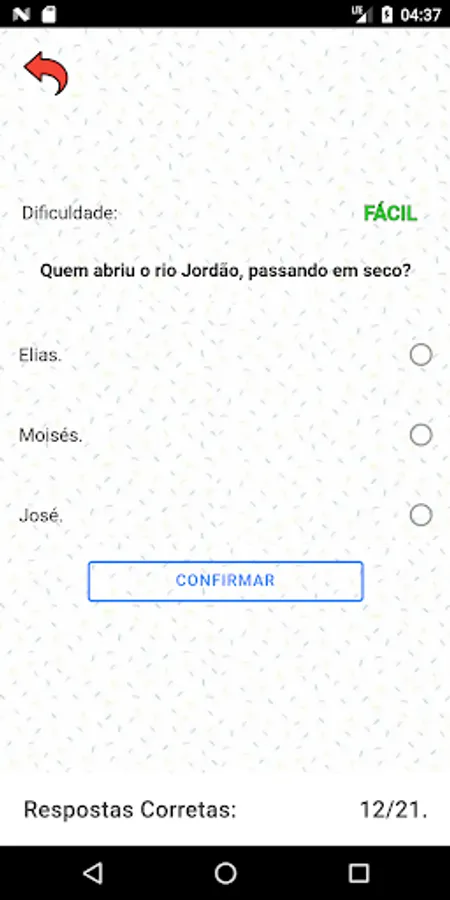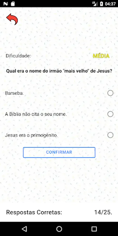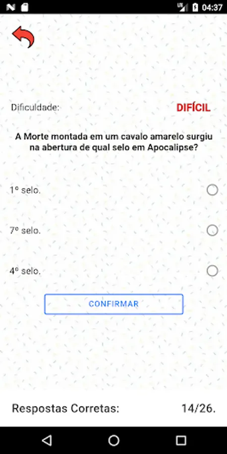 At the end of each question, the verse in which the answer is found or some information that proves that question will be shown. The answer will be informed in green if answered correctly or in red if answered wrongly. Each verse/answer will be visible for a pre-calculated time that can be confirmed by pressing the "ok" button on the side; it will only be possible to answer the next question when the verse/answer is dismissed from the screen.