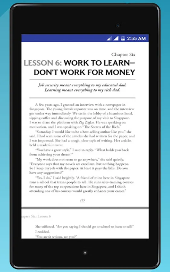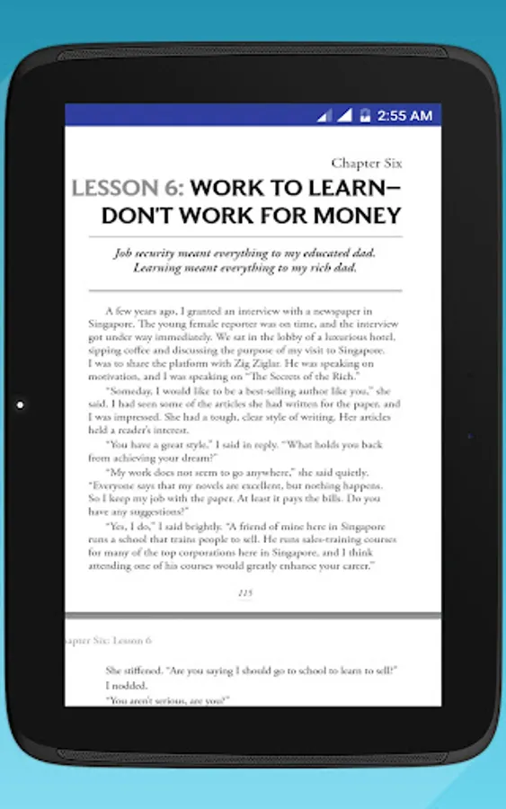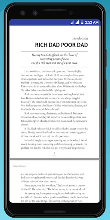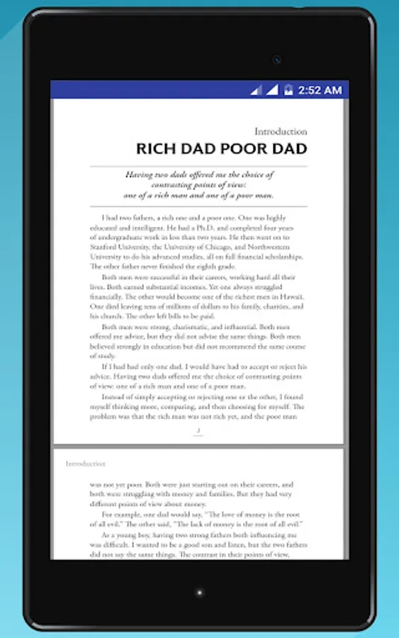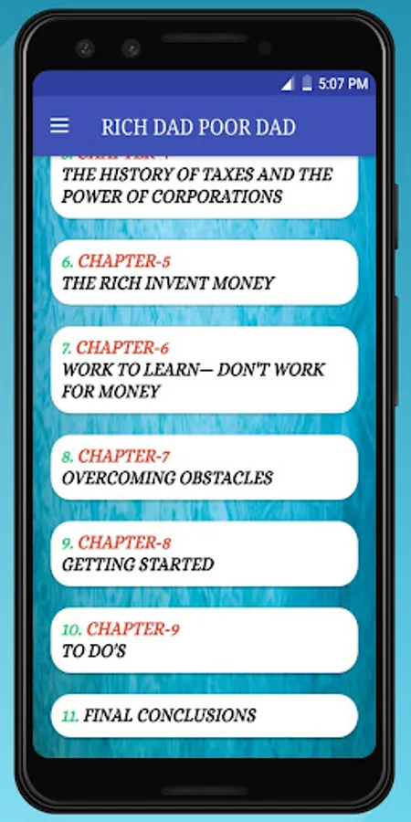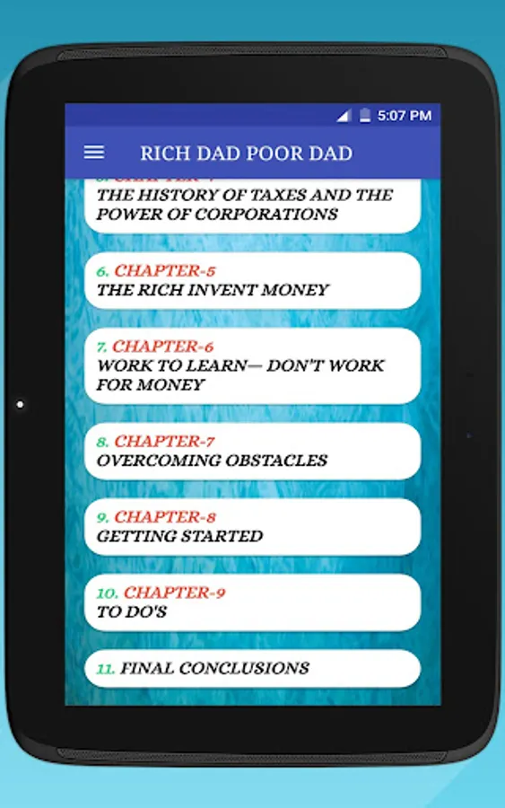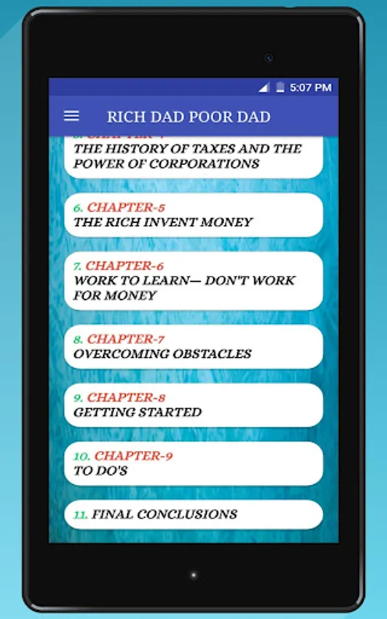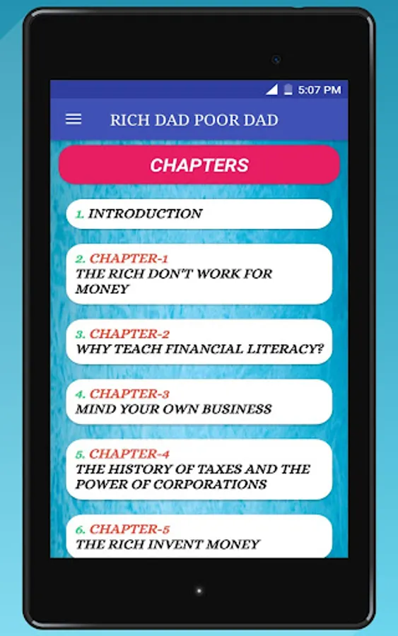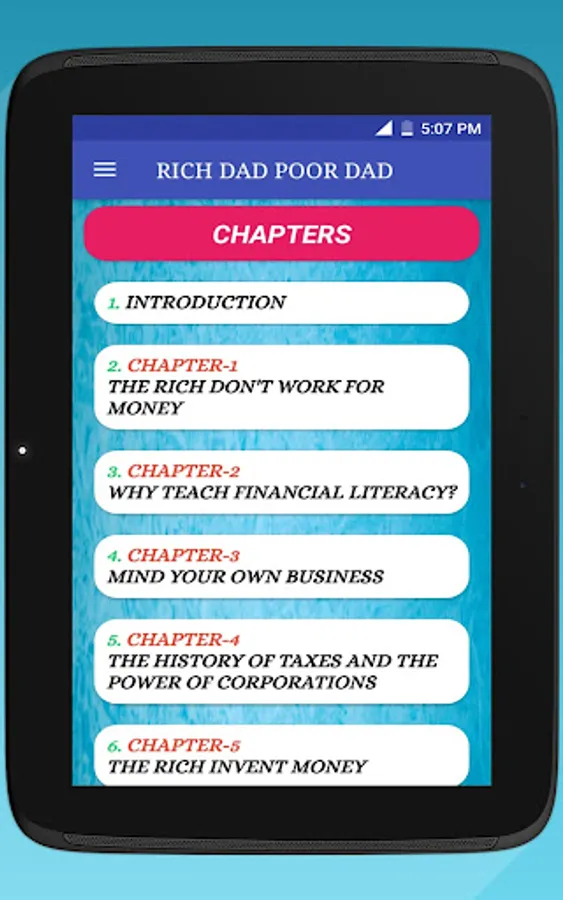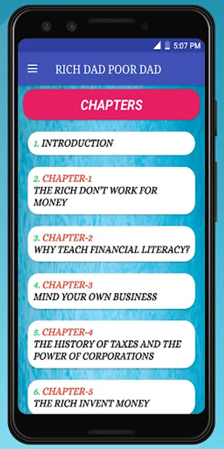 This Rich dad poor dad App advocates the importance of finances, financial independence and building wealth through investing in assets, real estate investing, investing in stock markets, trading shares, starting and owning businesses and not relying on loans, as well as increasing one's financial intelligence (financial IQ) to improve one's business and financial aptitude.