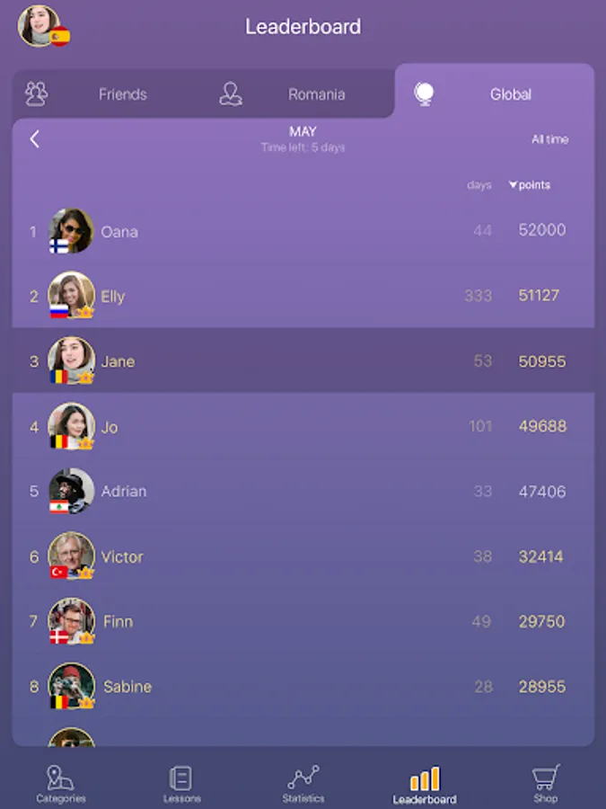 The Leaderboard. See how your friends are doing and compete with people from all over the world to become the best learner in the Mondly community family. Take the Weekly Quiz to become even better.