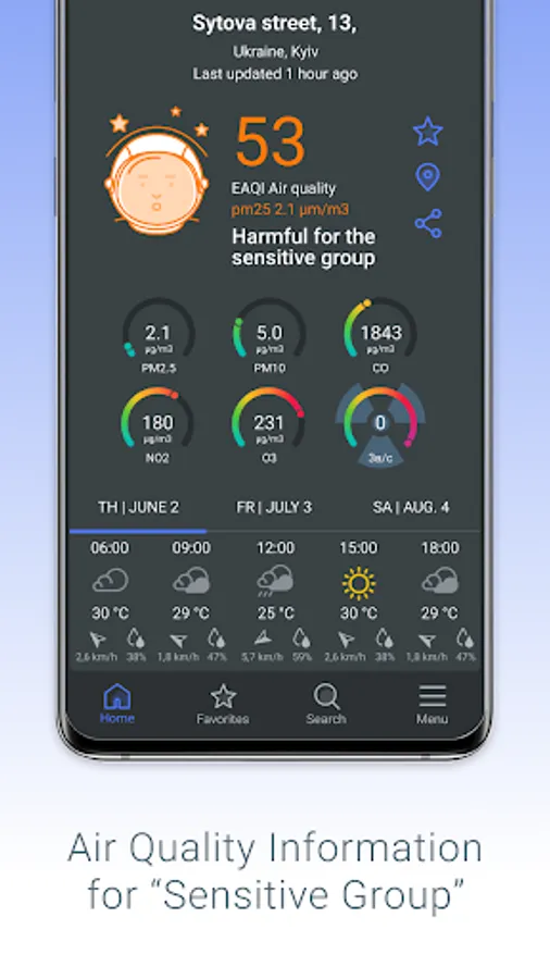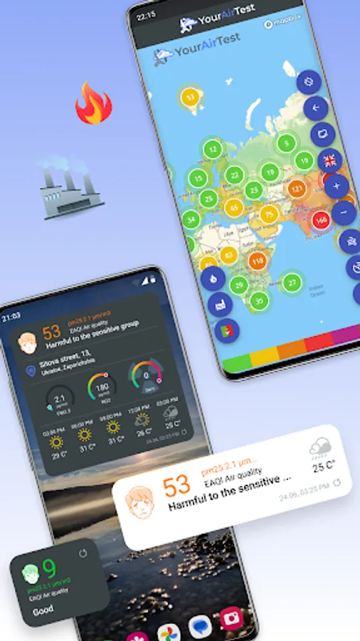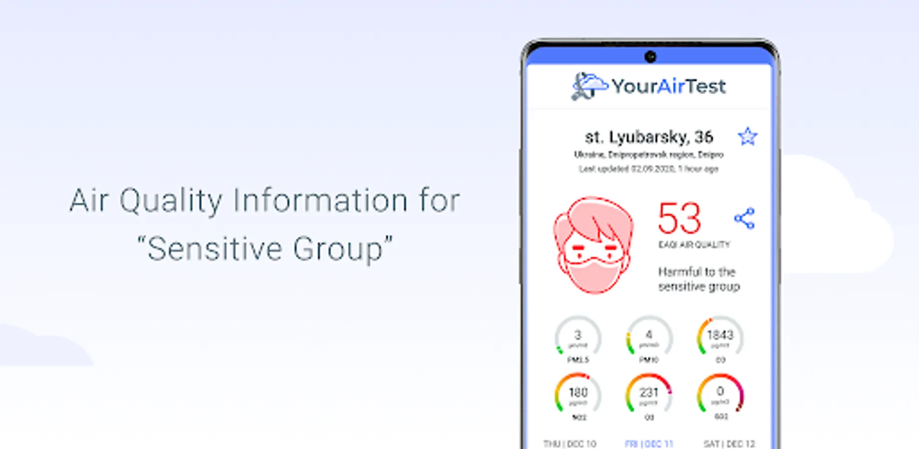 The YourAirTest app is designed for a healthy future for people to help reduce the impact of poor air quality on human health. With the help of machine learning YourAirTest provides the most accurate data on 6 Key Pollutants: particulate matter PM2.5 and PM10, O3 (ozone), NO2 (nitrogen dioxide), SO₂ (sulfur dioxide), and CO (carbon monoxide).