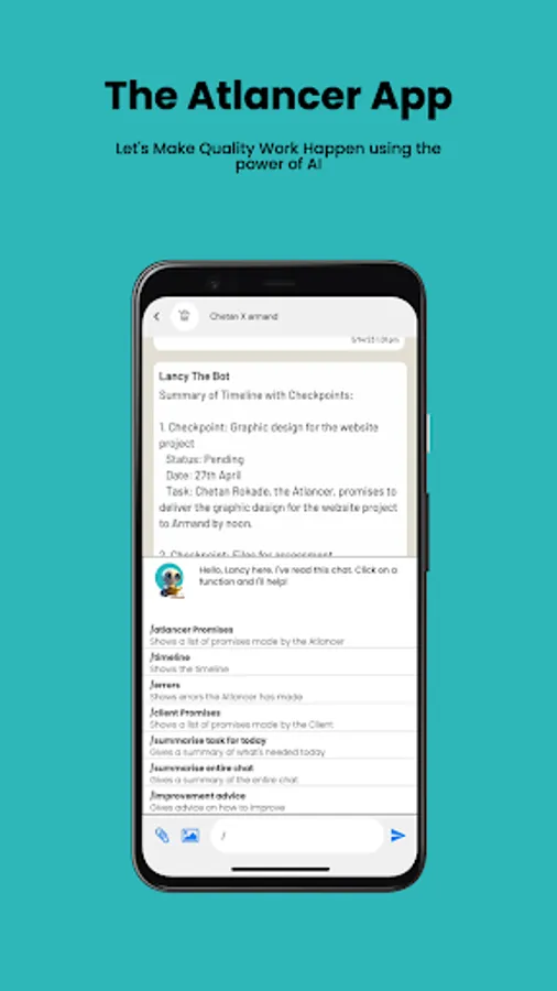Our standout feature is Lancy the Bot, our AI assistant. With a simple "/" command, Lancy springs into action, managing timelines, generating summaries, tracking promises, and more. Lancy ensures you never miss a deadline or lose sight of important project details.
