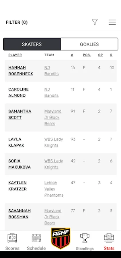 The Official Atlantic Girls Hockey Federation mobile app powered by GameSheet provides real-time access to player stats, standings, schedules, and game results.