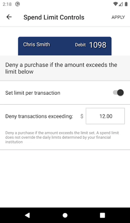 Alerts for PIN and signature transactions can be set up to keep you informed of your card usage and help you quickly detect unauthorized or fraudulent activity. This app can send an alert when a card is used or when a card transaction has been attempted but is declined – and additional customizable alert options are available. Alerts are sent in real time, immediately after a transaction has taken place.