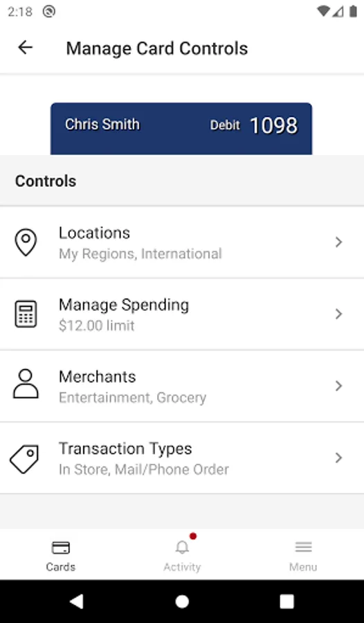 Spending limits can be established to allow transactions up to a certain dollar value and decline transactions when amounts exceed your defined thresholds. Transactions can be monitored and managed for specific merchant categories such as gas stations, department stores, restaurants entertainment, travel, and groceries. And your transactions can also be monitored for specific transaction types: in-store purchases, e-commerce transactions, mail/phone orders and ATM transactions.
