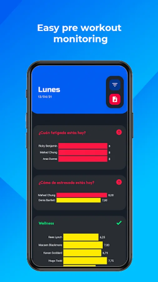 Training Feel allows you to export all the data to an excel file. In case you want to export the data of a team, the app will generate a file with two pages.