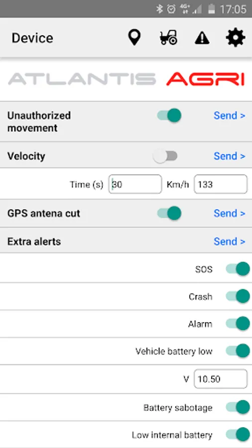 The Atlantis Agri application will help you have your vehicle controlled at all times and from the palm of your hand. You can locate it when you need it, and it will warn in case of attempted robbery (alarms). You can also configure the available sensor (velocity, displacement, accidents, etc).