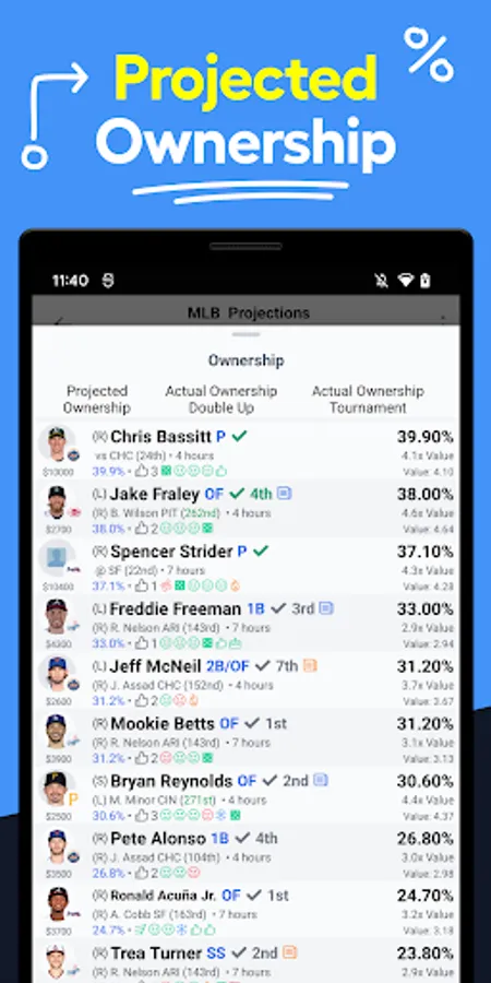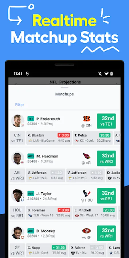 · Touch player's name to see an advanced-graph of their recent performance vs. our projections